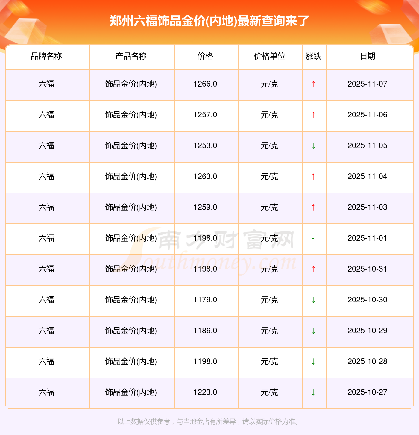 2025年11月9日寶泉錢幣、金蘭首飾、金蘭首飾、謝瑞麟、謝瑞麟、謝瑞麟、謝瑞麟、謝瑞麟、金銀街、金銀街、金銀街等各大金店品牌飾品金價(jià)(內(nèi)地)最新價(jià)格如下:寶泉錢幣銀條價(jià)格11.4元/克,金蘭首飾黃金價(jià)格1263.0元/克,金蘭首飾鉑金價(jià)格560.0元/克,謝瑞麟金條價(jià)格(內(nèi)地)1202.0元/克,謝瑞麟金飾價(jià)格(內(nèi)地)1268.0元/克,謝瑞麟黃金飾品(香港)44260.0,謝瑞麟鉑金飾品(香港)13080.0,謝瑞麟金條金價(jià)(香港)39960.0,金銀街投資金條1243.0元/克,金銀街工藝金條1258.0元/克,金銀街千足金首飾1248.0元/克。