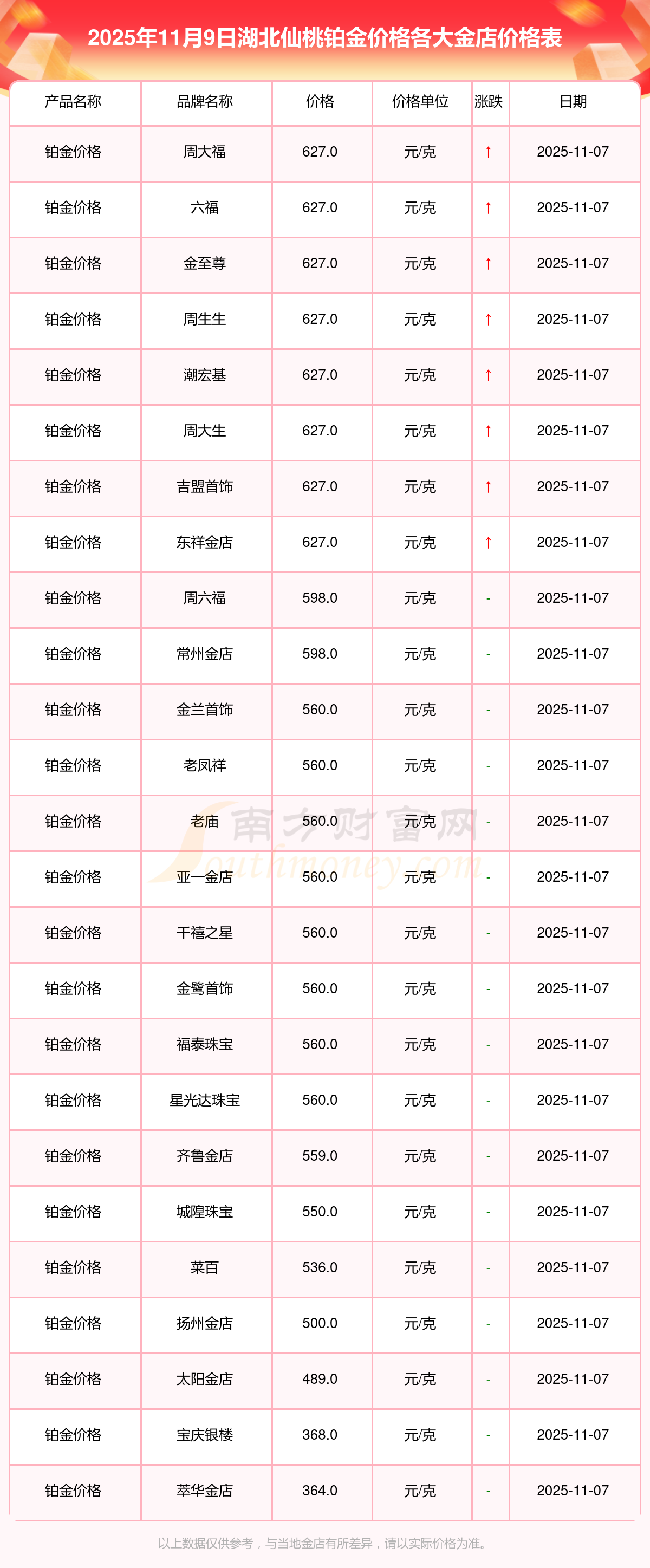 以上數(shù)據(jù)僅供參考,與當(dāng)?shù)仄放粕、金店、企業(yè)及銀行營業(yè)廳報(bào)價(jià)有所差異,依產(chǎn)品不同需另附工費(fèi),請以實(shí)際報(bào)價(jià)為準(zhǔn)。本站對價(jià)格等不作任何保證或承諾,請自行核實(shí)相關(guān)內(nèi)容,因此所引起的后果與本站無關(guān)。