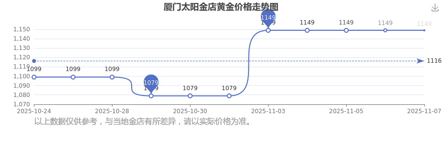 2025年11月9日廈門太陽金店黃金價格:1149.0元/克。