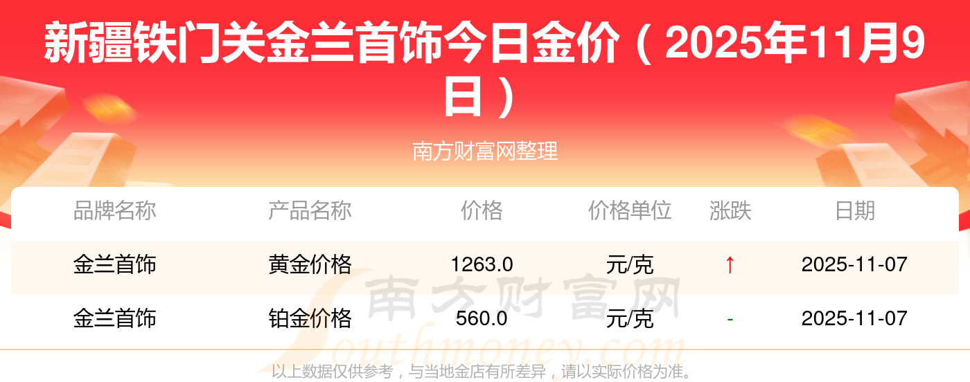 2025年11月9日新疆鐵門(mén)關(guān)金蘭首飾黃金按克計(jì)價(jià),現(xiàn)在多少錢(qián)一克?銀條價(jià)格11.4元/克,黃金價(jià)格1263.0元/克,鉑金價(jià)格560.0元/克,金條價(jià)格(內(nèi)地)1202.0元/克,金飾價(jià)格(內(nèi)地)1268.0元/克,黃金飾品(香港)44260.0,鉑金飾品(香港)13080.0,金條金價(jià)(香港)39960.0,投資金條1243.0元/克,工藝金條1258.0元/克,千足金首飾1248.0元/克。