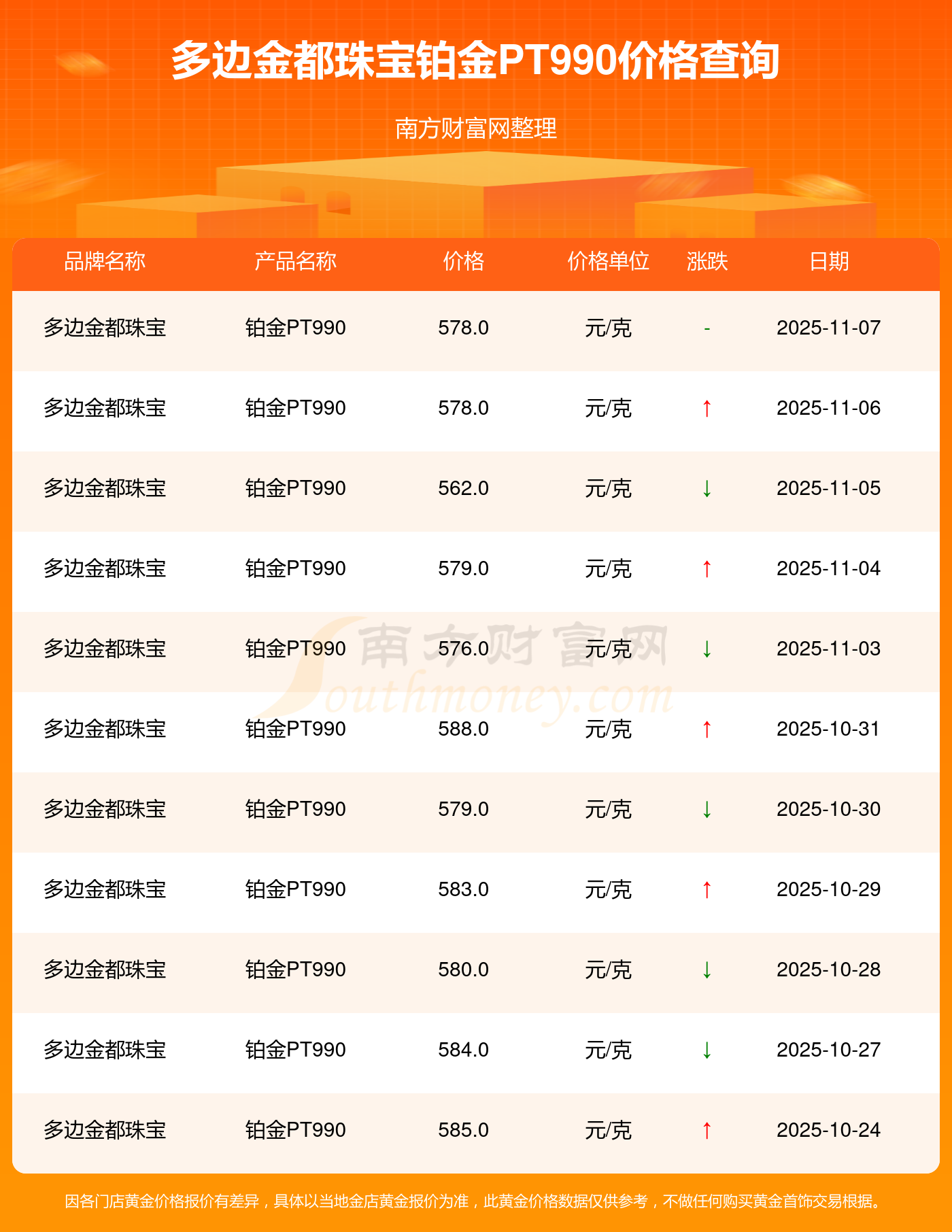 今日多邊金都珠寶鉑金PT990價(jià)格是578.0元/克。