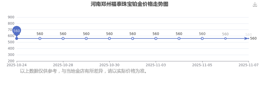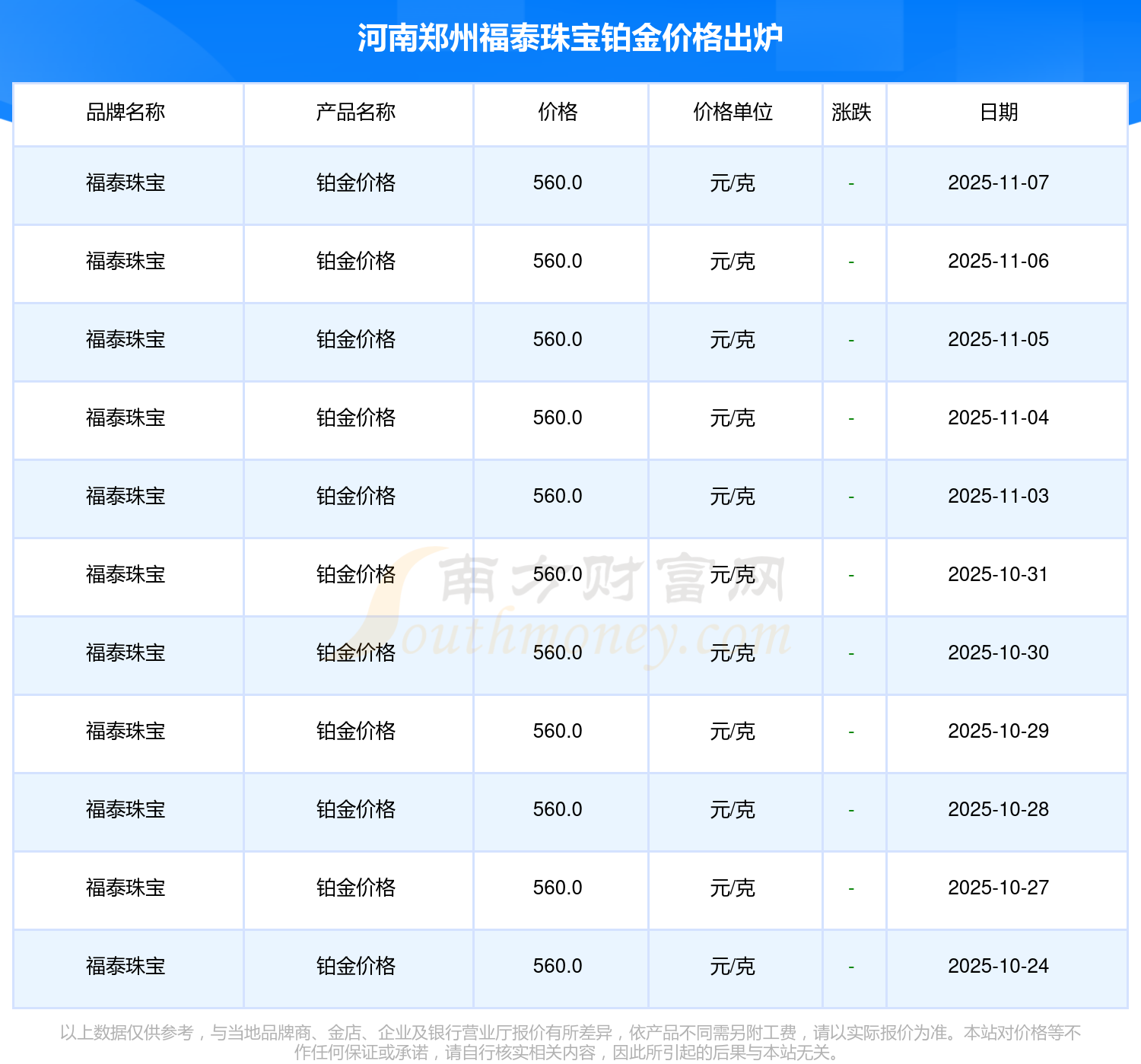 今日2025年11月9日,河南鄭州福泰珠寶鉑金價格為560.0元/克。