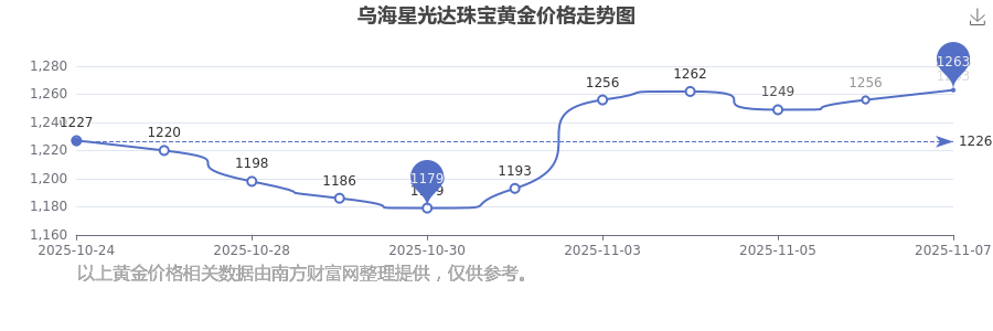 今日2025年11月9日,烏海星光達(dá)珠寶黃金價(jià)格為1263.0元/克。