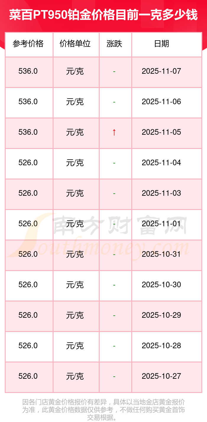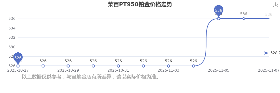 菜百今日PT950鉑金的最新市場行情價(jià)為536.0元/克。