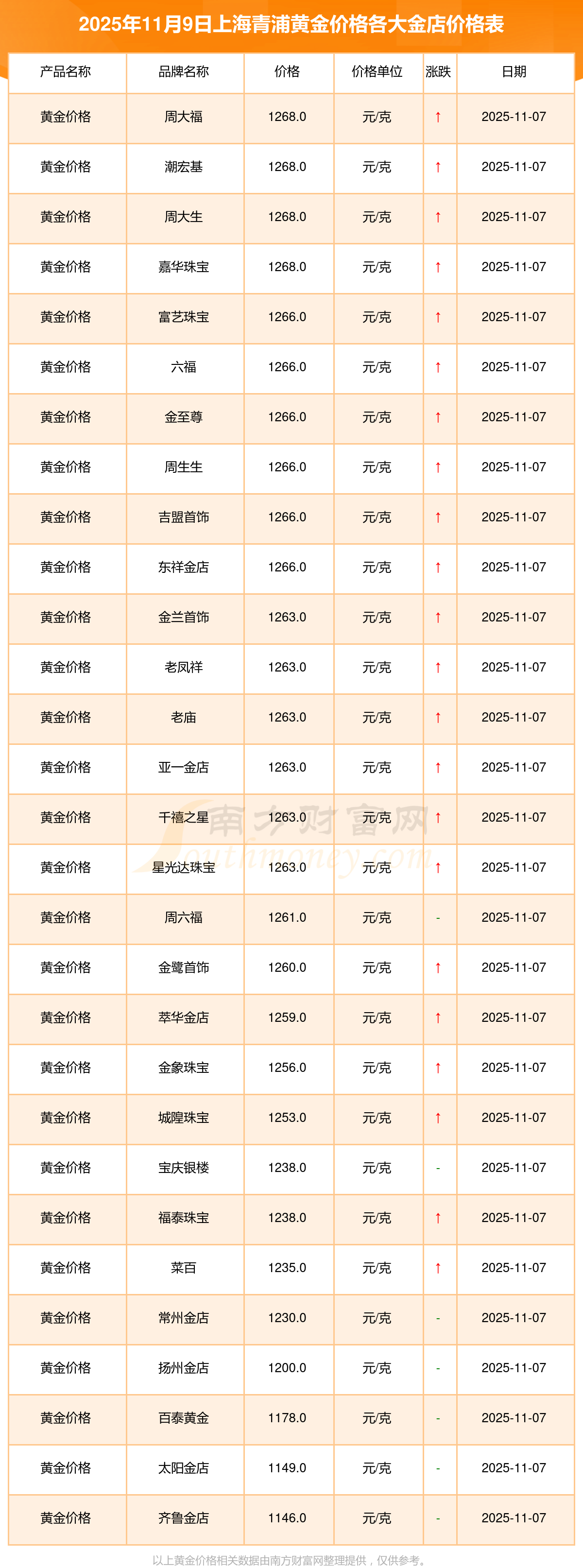 2025年11月9日上海青浦各大金店黃金價(jià)格最新價(jià)格:寶泉錢(qián)幣11.4元/克,金蘭首飾1263.0元/克,金蘭首飾560.0元/克,謝瑞麟1202.0元/克,謝瑞麟1268.0元/克,謝瑞麟44260.0,謝瑞麟13080.0,謝瑞麟39960.0,金銀街1243.0元/克,金銀街1258.0元/克,金銀街1248.0元/克。