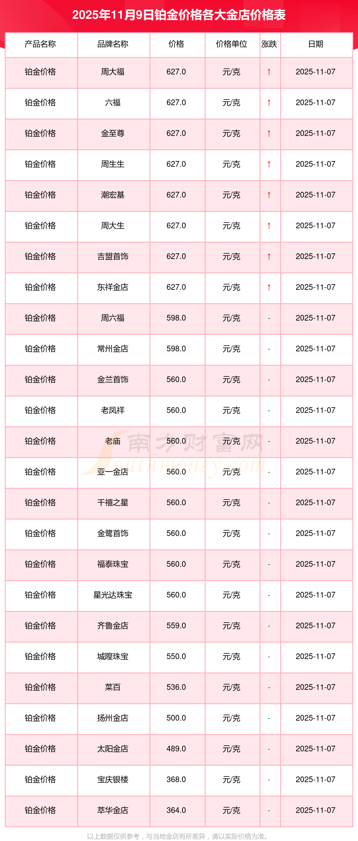 2025年11月9日寶泉錢幣、金蘭首飾、金蘭首飾、謝瑞麟、謝瑞麟、謝瑞麟、謝瑞麟、謝瑞麟、金銀街、金銀街、金銀街等各大金店品牌鉑金價格最新價格如下:寶泉錢幣銀條價格11.4元/克,金蘭首飾黃金價格1263.0元/克,金蘭首飾鉑金價格560.0元/克,謝瑞麟金條價格(內(nèi)地)1202.0元/克,謝瑞麟金飾價格(內(nèi)地)1268.0元/克,謝瑞麟黃金飾品(香港)44260.0,謝瑞麟鉑金飾品(香港)13080.0,謝瑞麟金條金價(香港)39960.0,金銀街投資金條1243.0元/克,金銀街工藝金條1258.0元/克,金銀街千足金首飾1248.0元/克。