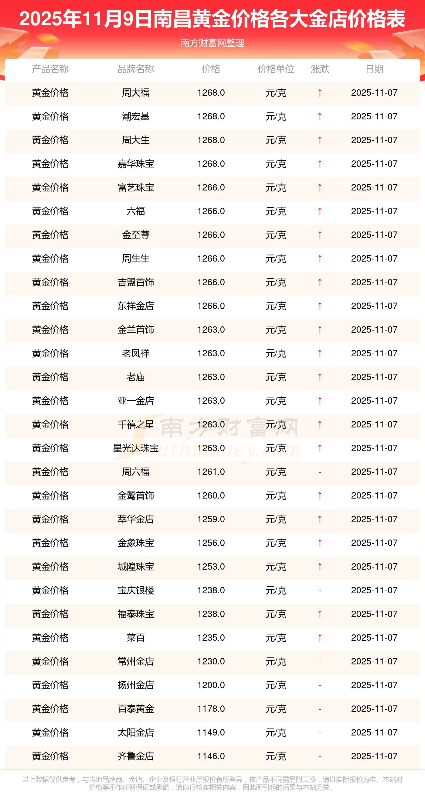 今天是2025年11月9日,南昌寶泉錢(qián)幣、金蘭首飾、金蘭首飾、謝瑞麟、謝瑞麟、謝瑞麟、謝瑞麟、謝瑞麟、金銀街、金銀街、金銀街等各大金店品牌黃金價(jià)格最新價(jià)格行情是這樣的:寶泉錢(qián)幣11.4元/克、金蘭首飾1263.0元/克、金蘭首飾560.0元/克、謝瑞麟1202.0元/克、謝瑞麟1268.0元/克、謝瑞麟44260.0、謝瑞麟13080.0、謝瑞麟39960.0、金銀街1243.0元/克、金銀街1258.0元/克、金銀街1248.0元/克。