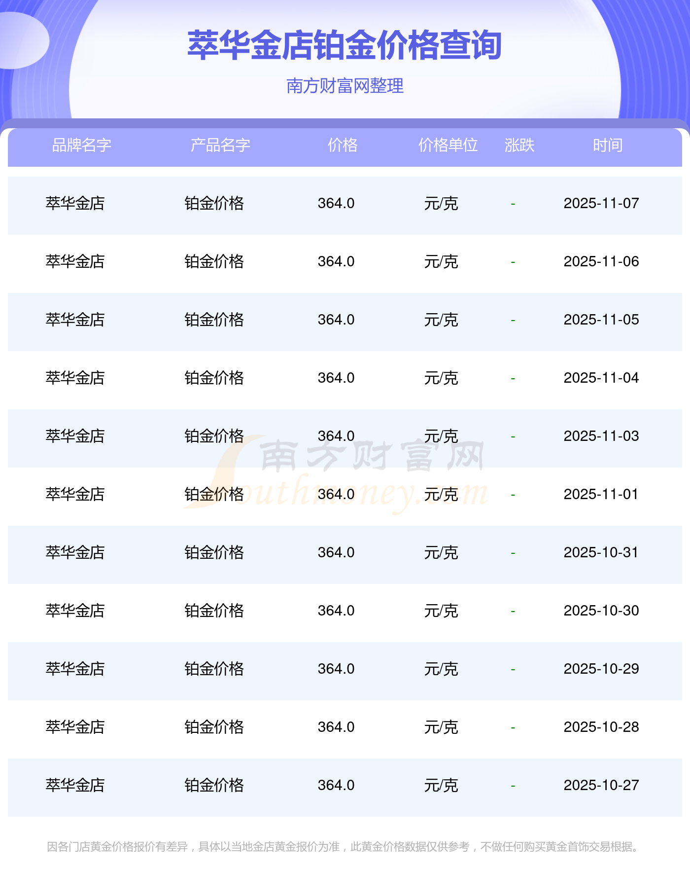 今日(2025年11月9日),萃華金店鉑金價(jià)格最新價(jià)格是364.0元/克。