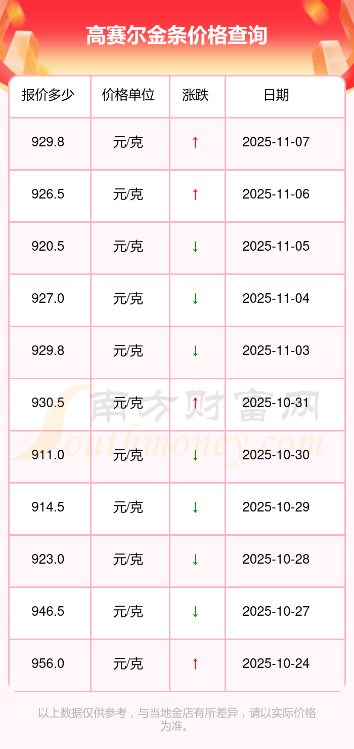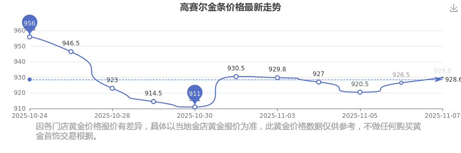 2025年11月9日高賽爾金條價格最新是929.8元/克。