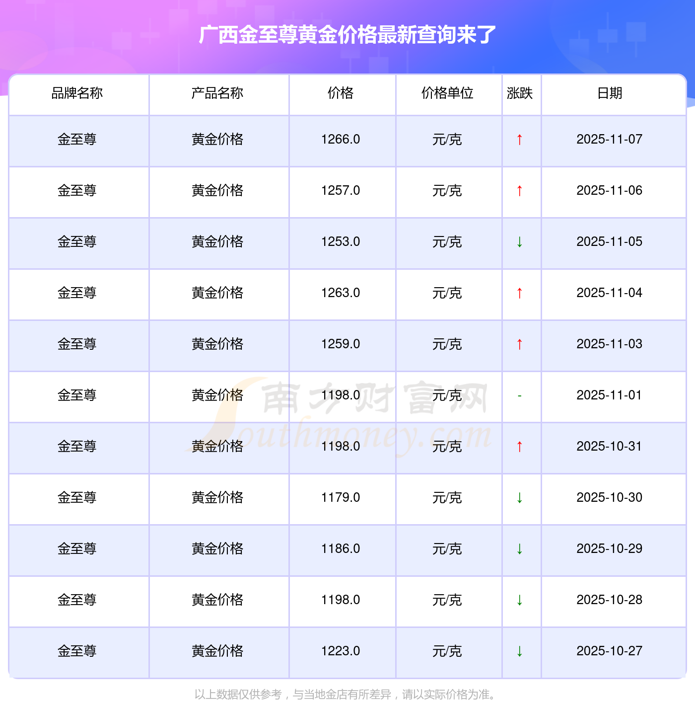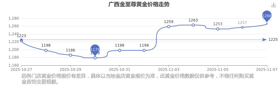 廣西金至尊今日黃金價(jià)格每克多少錢(qián)?此刻一克黃金的售賣價(jià)是多少?今日廣西金至尊黃金價(jià)格查詢,今日廣西金至尊黃金價(jià)格為1266.0元/克。