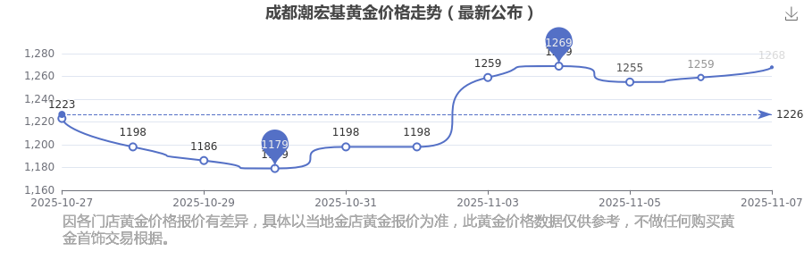 2025年11月9日,成都潮宏基黃金價格每克的售賣價位為1268.0元/克。