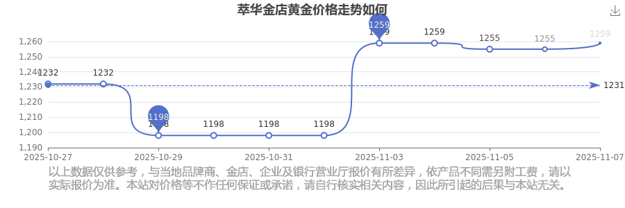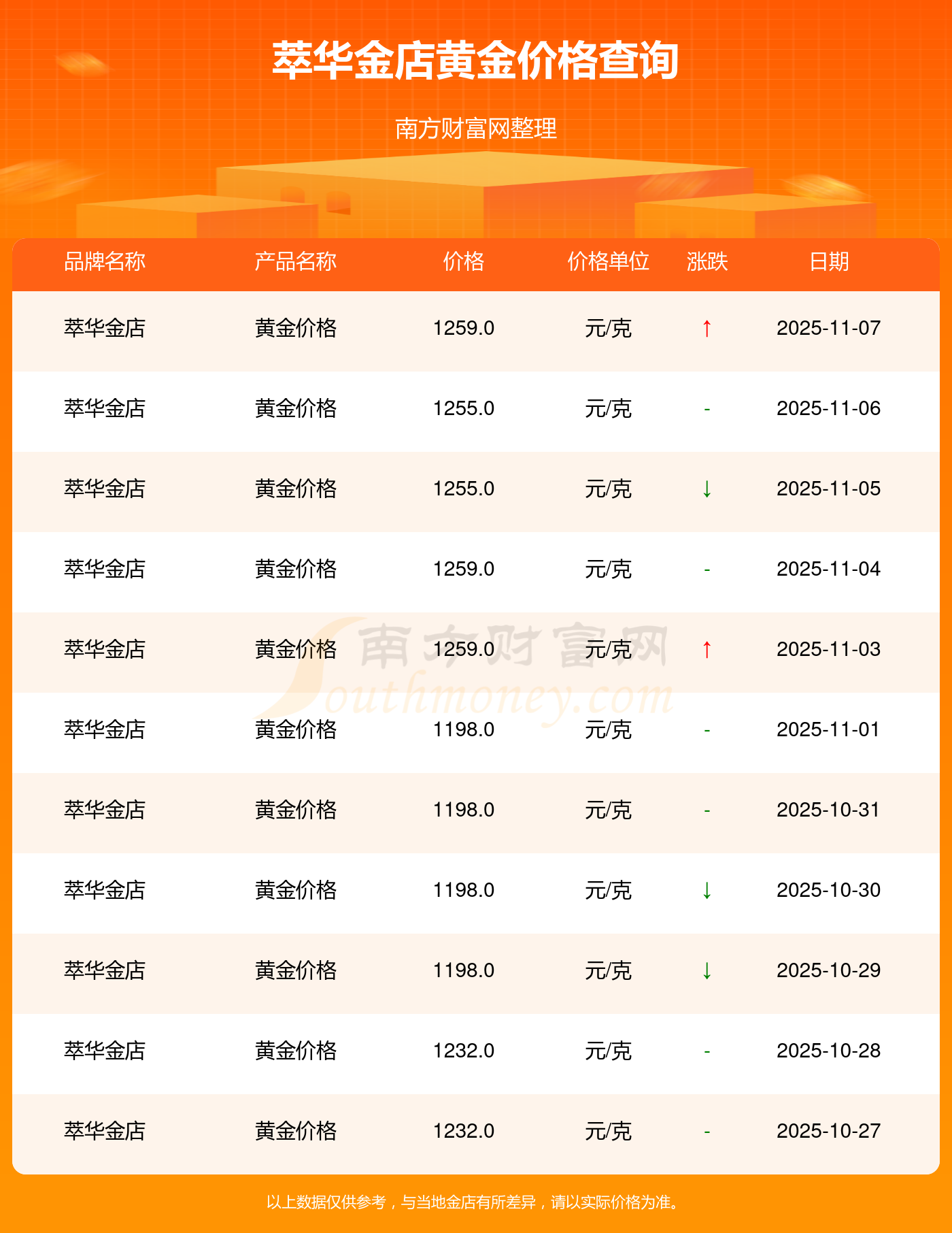 2025年11月9日萃華金店黃金價(jià)格是1259.0元/克。