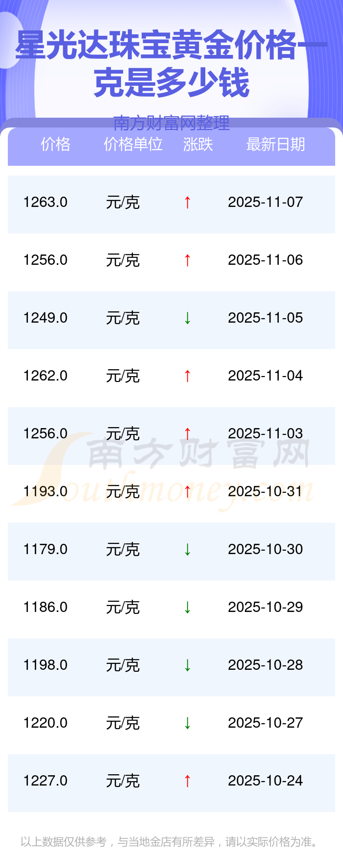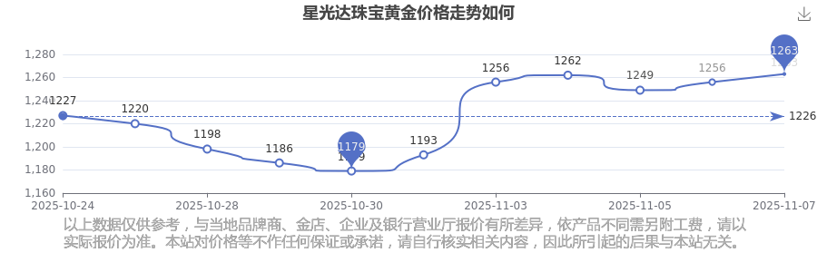 今日(2025年11月9日),星光達(dá)珠寶黃金價(jià)格:1263.0元/克。
