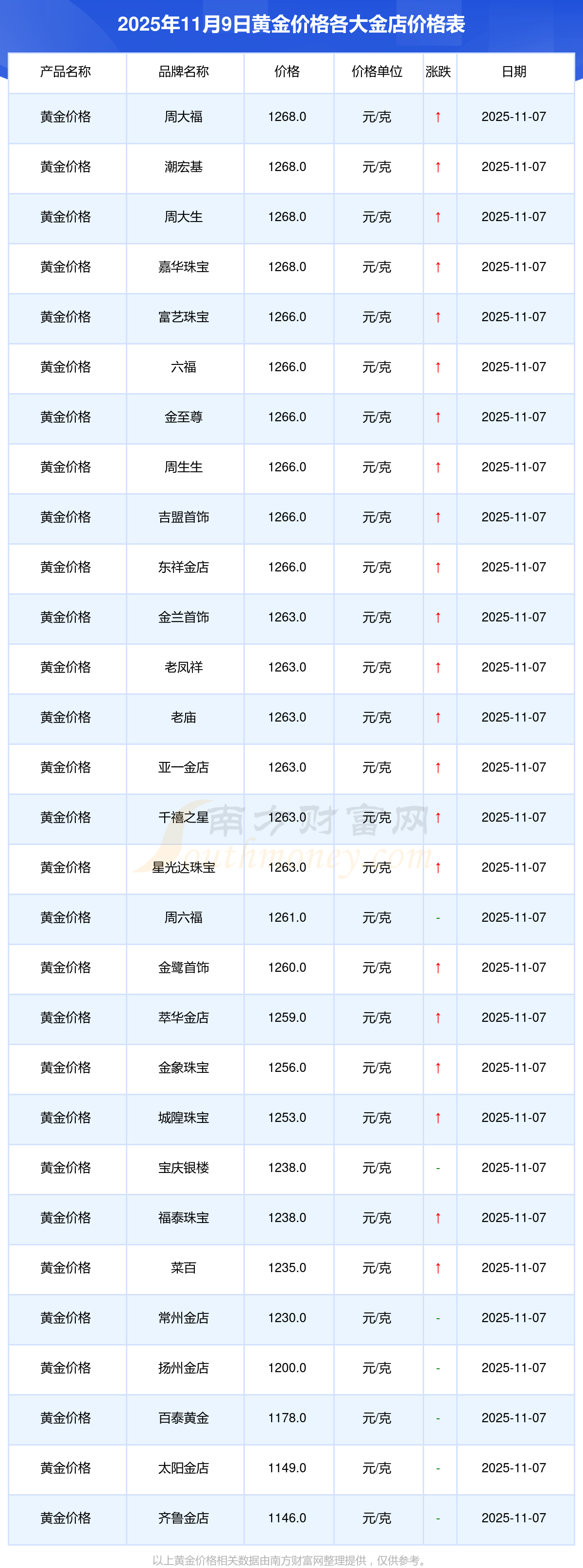 2025年11月9日各大金店黃金價格最新價格:寶泉錢幣11.4元/克,金蘭首飾1263.0元/克,金蘭首飾560.0元/克,謝瑞麟1202.0元/克,謝瑞麟1268.0元/克,謝瑞麟44260.0,謝瑞麟13080.0,謝瑞麟39960.0,金銀街1243.0元/克,金銀街1258.0元/克,金銀街1248.0元/克。