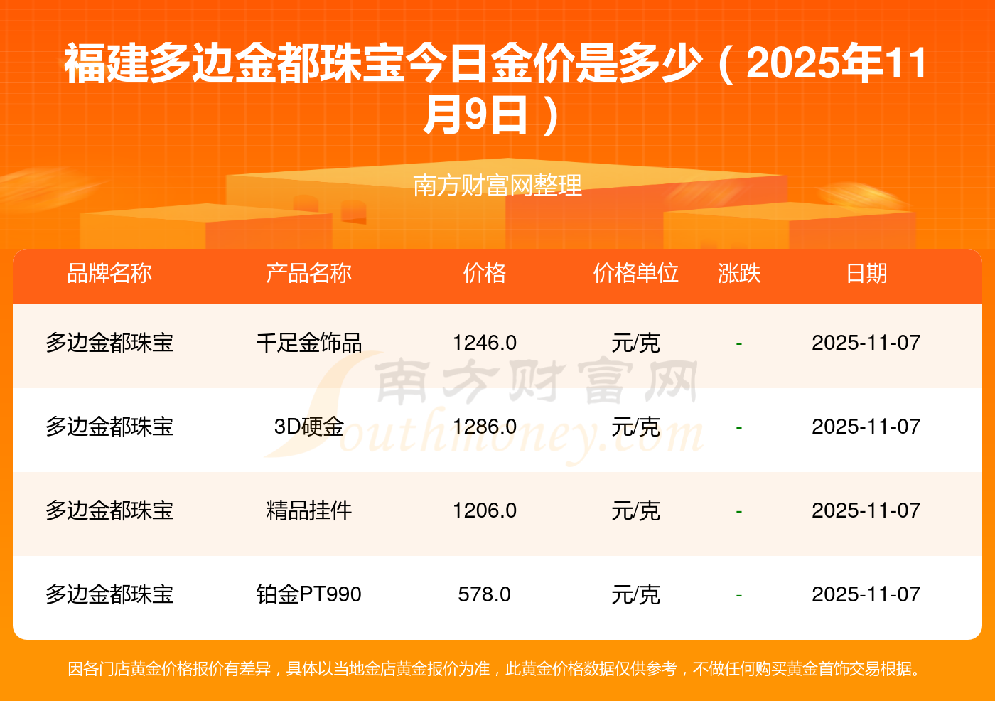 2025年11月9日福建多邊金都珠寶一克黃金的售價(jià)是多少:銀條價(jià)格11.4元/克,黃金價(jià)格1263.0元/克,鉑金價(jià)格560.0元/克,金條價(jià)格(內(nèi)地)1202.0元/克,金飾價(jià)格(內(nèi)地)1268.0元/克,黃金飾品(香港)44260.0,鉑金飾品(香港)13080.0,金條金價(jià)(香港)39960.0,投資金條1243.0元/克,工藝金條1258.0元/克,千足金首飾1248.0元/克。