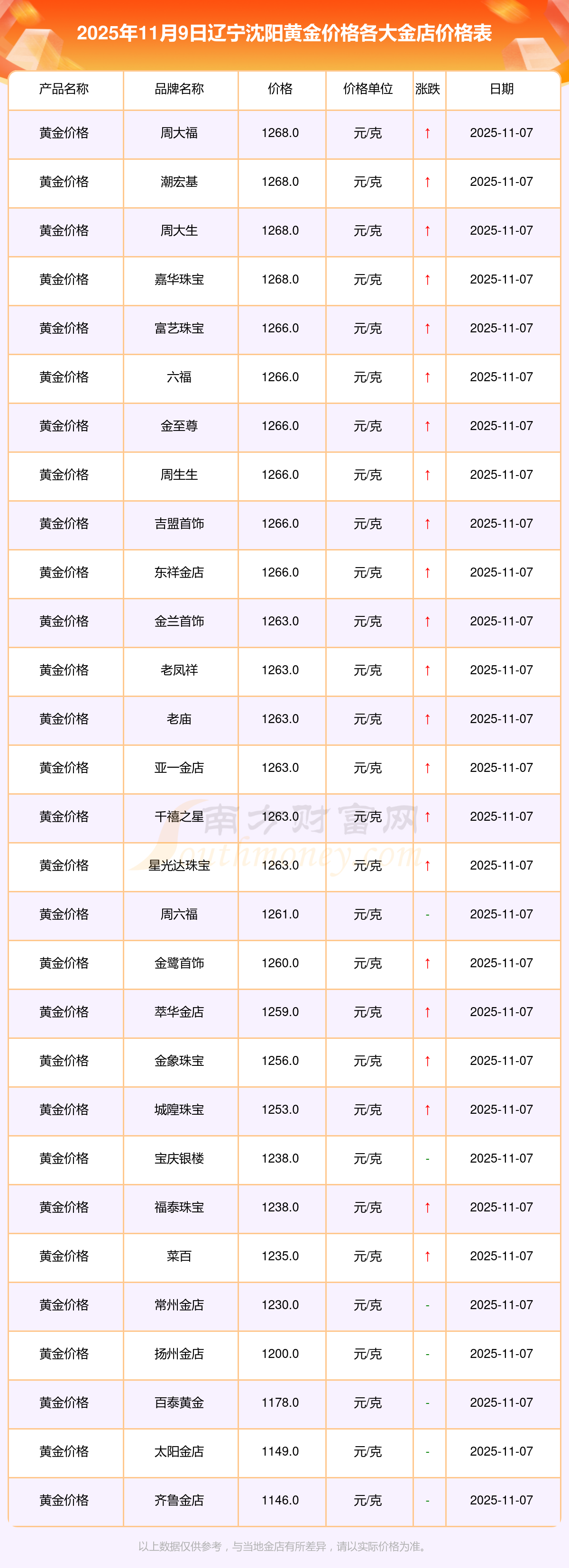 今天是2025年11月9日,遼寧沈陽寶泉錢幣、金蘭首飾、金蘭首飾、謝瑞麟、謝瑞麟、謝瑞麟、謝瑞麟、謝瑞麟、金銀街、金銀街、金銀街等各大金店品牌黃金價格最新價格行情是這樣的:寶泉錢幣11.4元/克、金蘭首飾1263.0元/克、金蘭首飾560.0元/克、謝瑞麟1202.0元/克、謝瑞麟1268.0元/克、謝瑞麟44260.0、謝瑞麟13080.0、謝瑞麟39960.0、金銀街1243.0元/克、金銀街1258.0元/克、金銀街1248.0元/克。