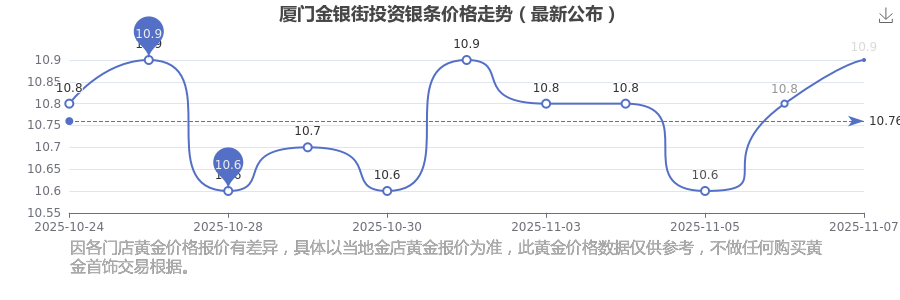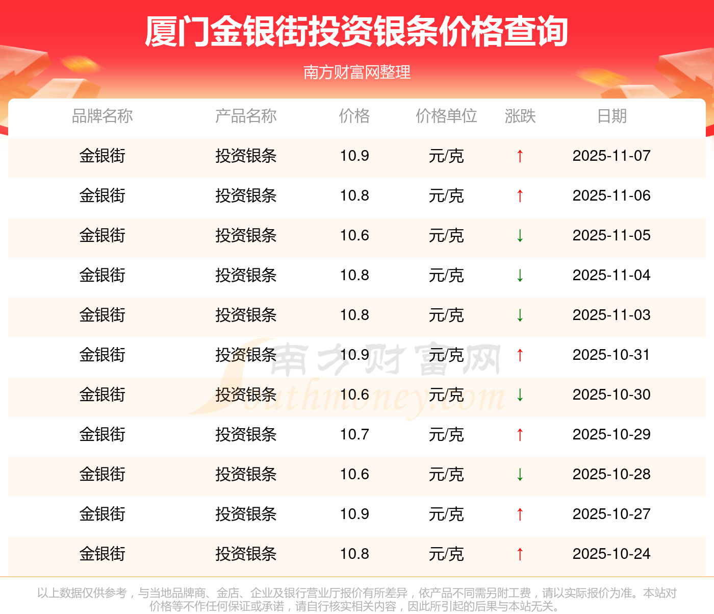 今日(2025年11月9日)廈門金銀街投資銀條價(jià)格為10.9元/克。