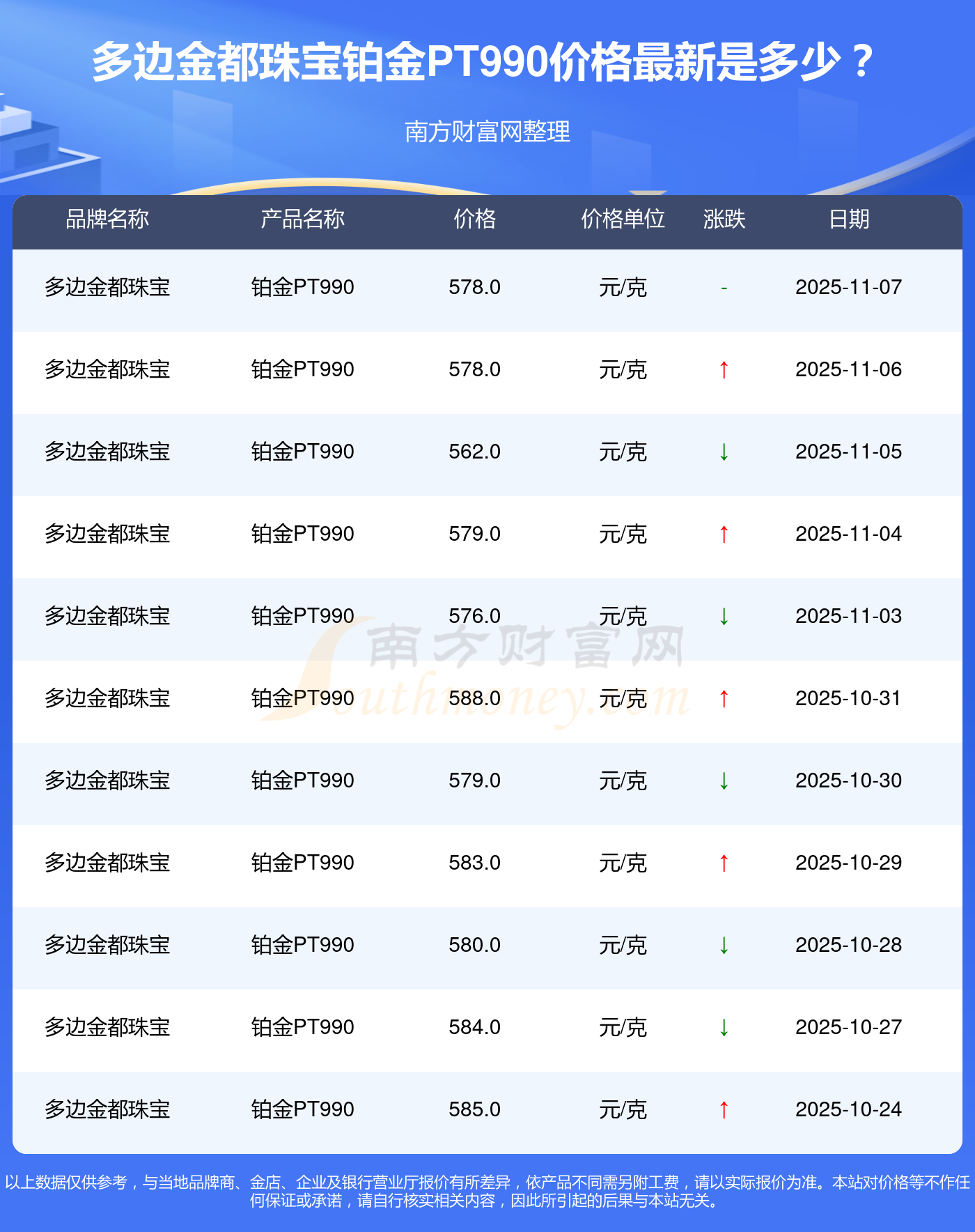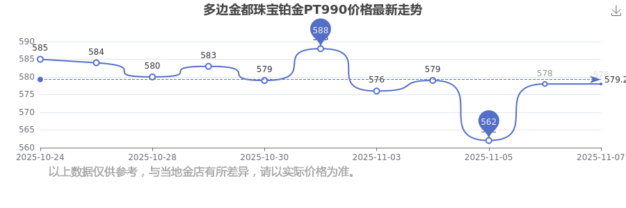 578.0元/克是多邊金都珠寶在今日給出的 鉑金PT990最新價格。