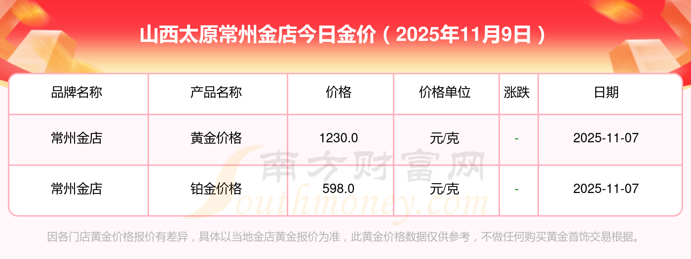 山西太原常州金店金價今日價格最新_山西太原常州金店黃金多少錢一克2025年11月9日,隨小編來了解一下詳情。