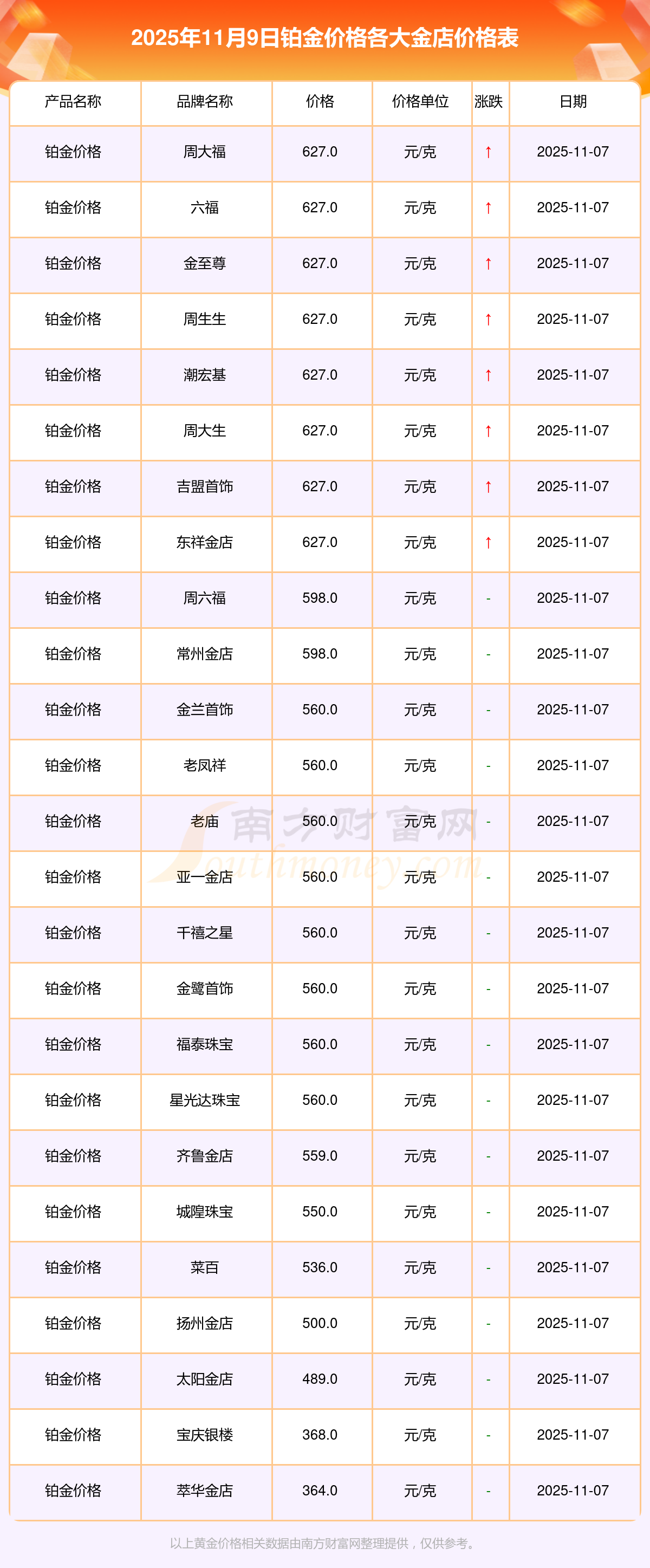 2025年11月9日各大金店鉑金價(jià)格最新價(jià)格:寶泉錢(qián)幣11.4元/克,金蘭首飾1263.0元/克,金蘭首飾560.0元/克,謝瑞麟1202.0元/克,謝瑞麟1268.0元/克,謝瑞麟44260.0,謝瑞麟13080.0,謝瑞麟39960.0,金銀街1243.0元/克,金銀街1258.0元/克,金銀街1248.0元/克。