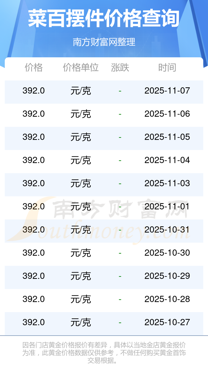 今日(2025年11月9日)菜百擺件價格是392.0元/克。