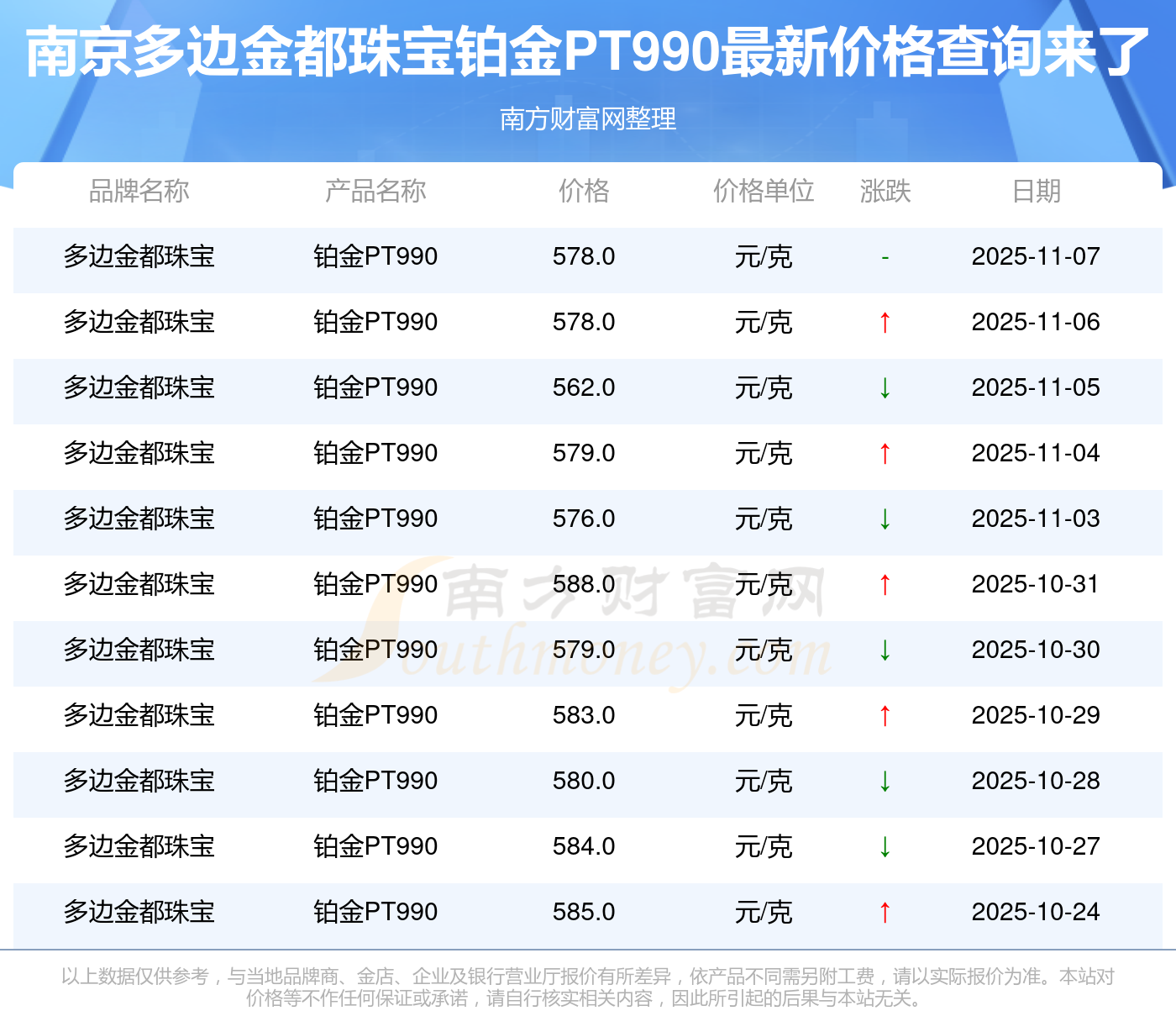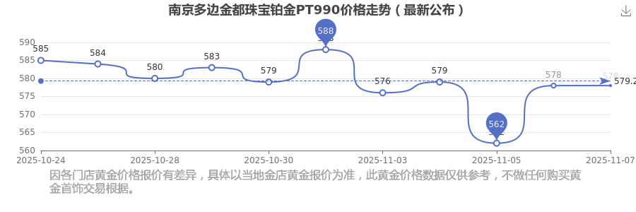 南京多邊金都珠寶的鉑金PT990在今日(2025年11月9日),每克售價(jià)為578.0元/克。