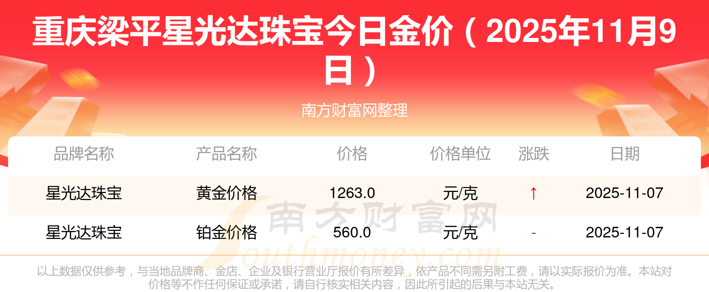 2025年11月9日重慶梁平星光達(dá)珠寶一克黃金對(duì)應(yīng)的價(jià)格是多少?銀條價(jià)格11.4元/克,黃金價(jià)格1263.0元/克,鉑金價(jià)格560.0元/克,金條價(jià)格(內(nèi)地)1202.0元/克,金飾價(jià)格(內(nèi)地)1268.0元/克,黃金飾品(香港)44260.0,鉑金飾品(香港)13080.0,金條金價(jià)(香港)39960.0,投資金條1243.0元/克,工藝金條1258.0元/克,千足金首飾1248.0元/克。