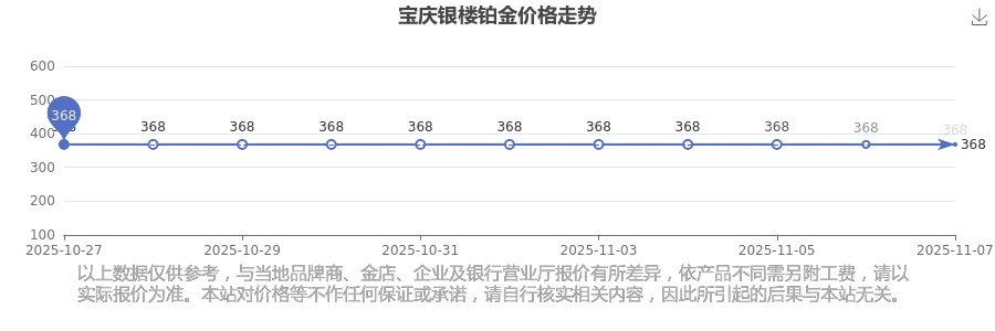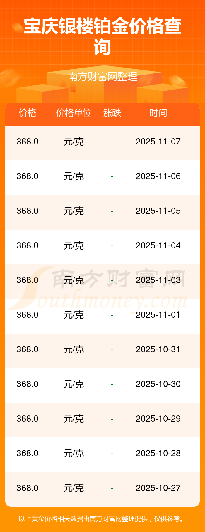 據(jù)了解,寶慶銀樓今日鉑金價(jià)格為368.0元/克。