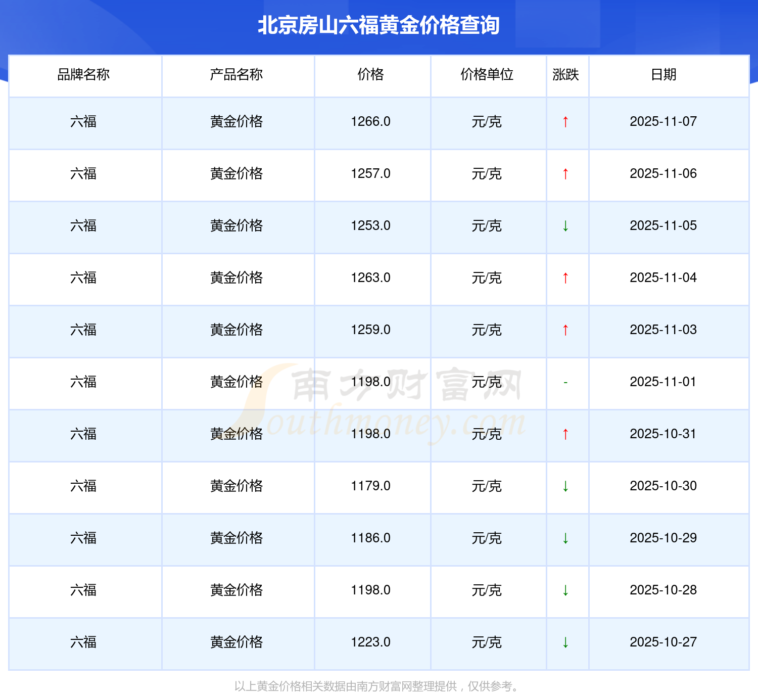 今日北京房山六福黃金價格公布今日每克黃金在零售市場的價格是多少2025年11月9日北京房山六福黃金價格為1266.0元/克。