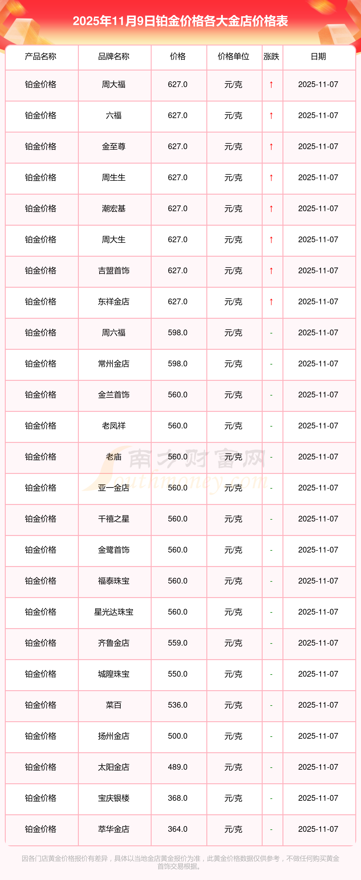 2025年11月9日各大金店鉑金價格最新價格:寶泉錢幣11.4元/克,金蘭首飾1263.0元/克,金蘭首飾560.0元/克,謝瑞麟1202.0元/克,謝瑞麟1268.0元/克,謝瑞麟44260.0,謝瑞麟13080.0,謝瑞麟39960.0,金銀街1243.0元/克,金銀街1258.0元/克,金銀街1248.0元/克。
