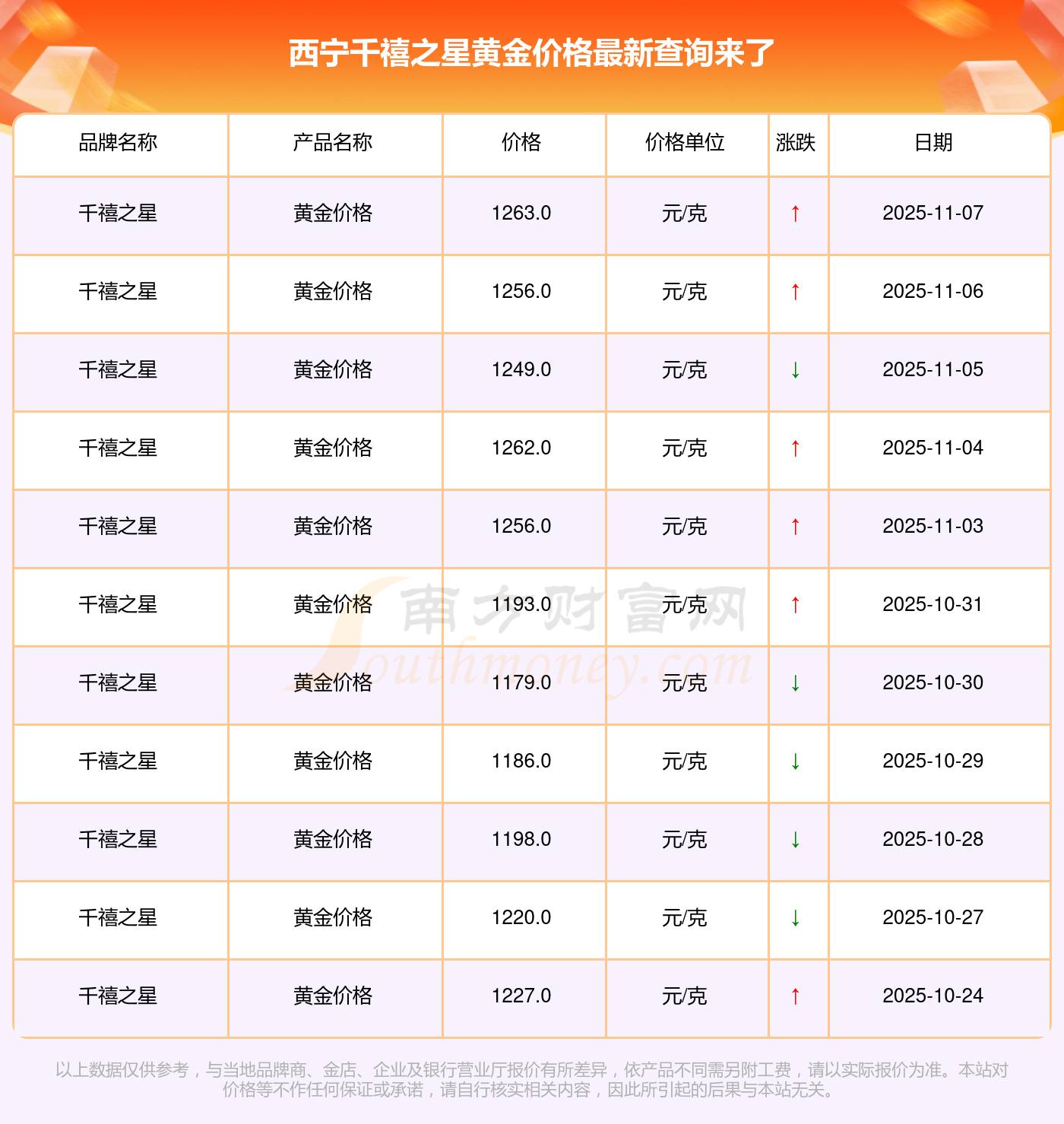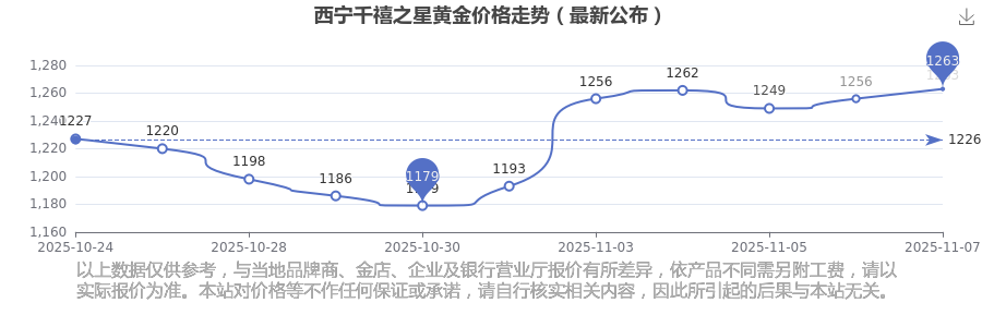 今日(2025年11月9日)西寧千禧之星黃金價(jià)格最新價(jià)格為1263.0元/克。