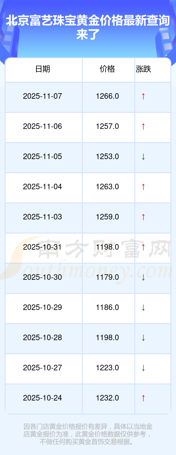 今日北京富藝珠寶黃金價格為1266.0元/克。