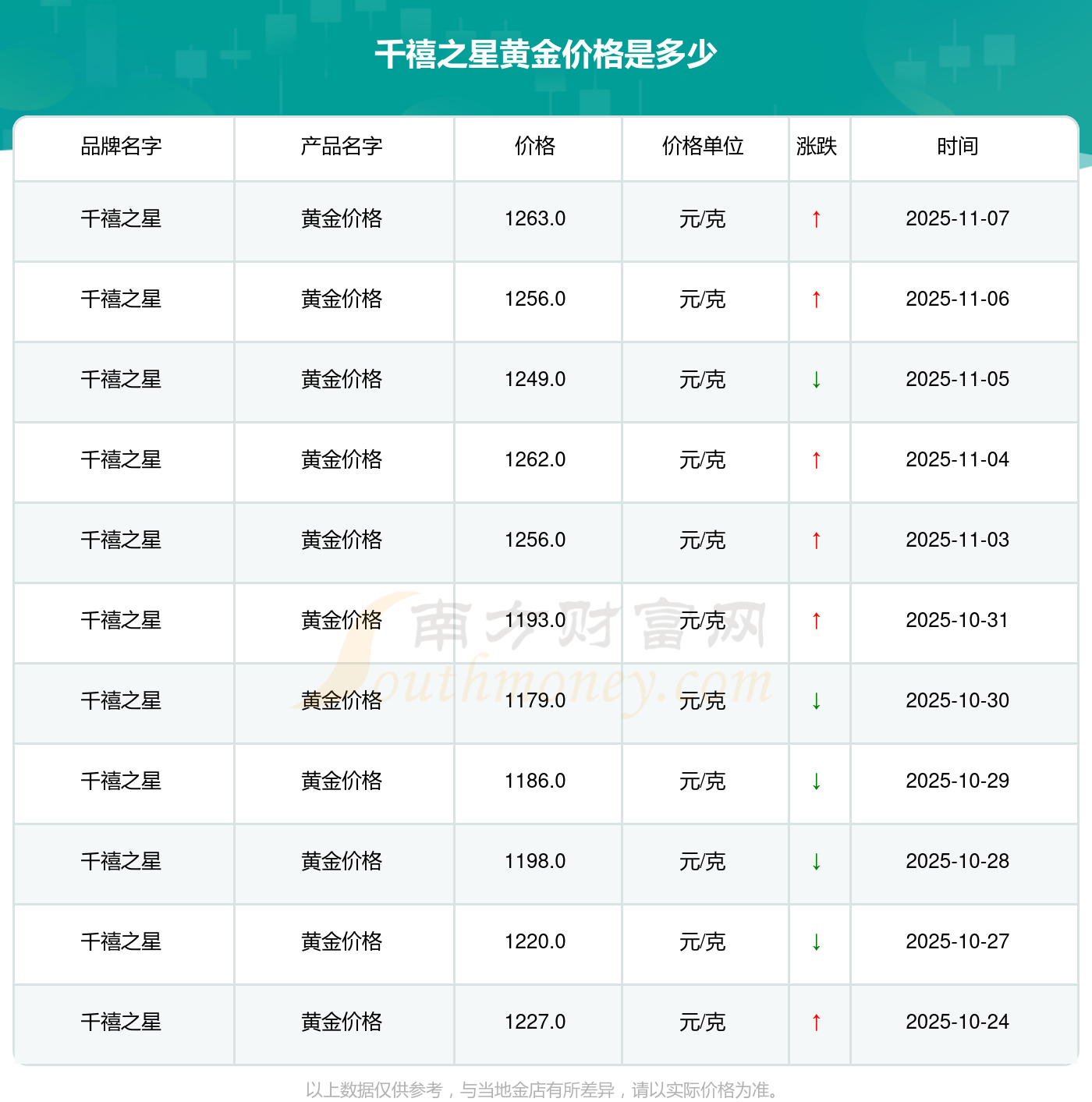 想查詢今日黃金價(jià)格,當(dāng)下黃金一克具體售價(jià)幾何?黃金每一克的價(jià)格大概是多少?今日千禧之星黃金價(jià)格為1263.0元/克。