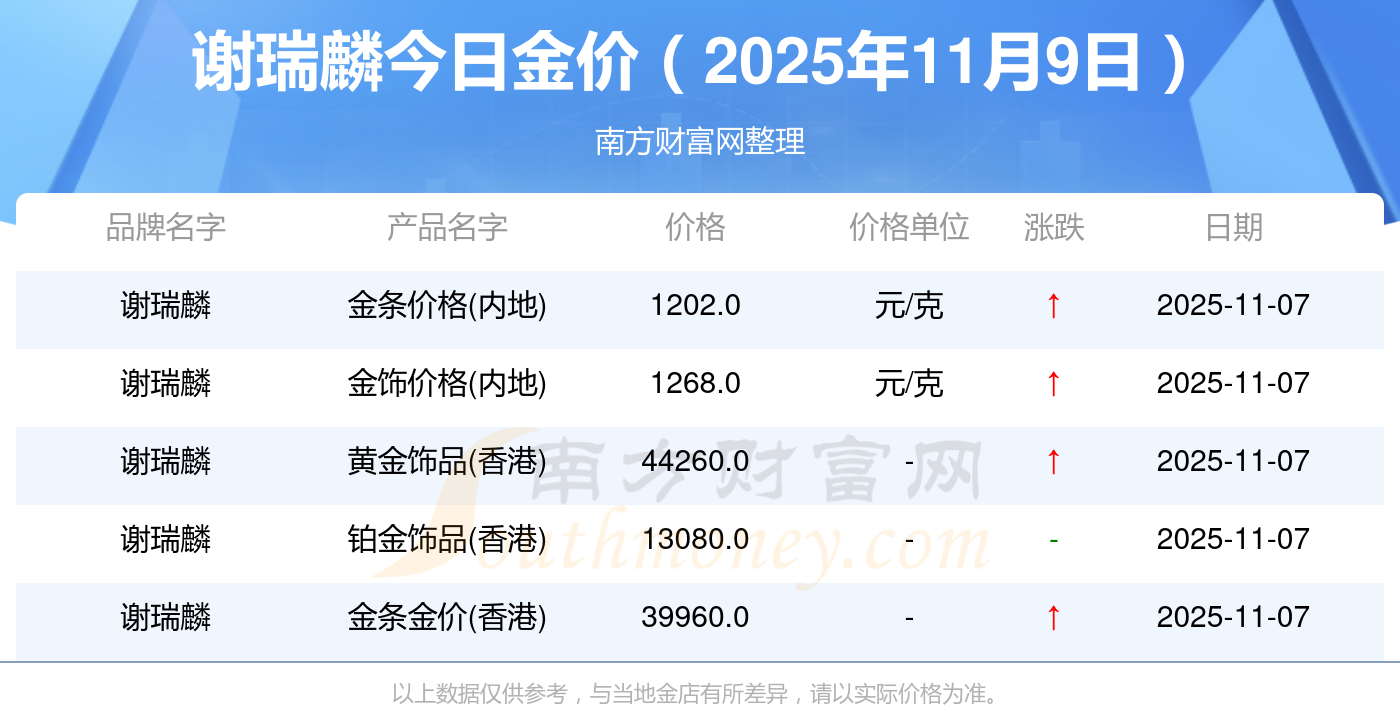 現(xiàn)在謝瑞麟黃金價(jià)格是多少錢1克_2025年謝瑞麟今日金價(jià)是多少錢一克,最新謝瑞麟查詢,2025年11月9日謝瑞麟金飾價(jià)格(內(nèi)地)現(xiàn)在每克多少錢?最新謝瑞麟金飾價(jià)格(內(nèi)地)報(bào)價(jià)公布,一起來看看吧!