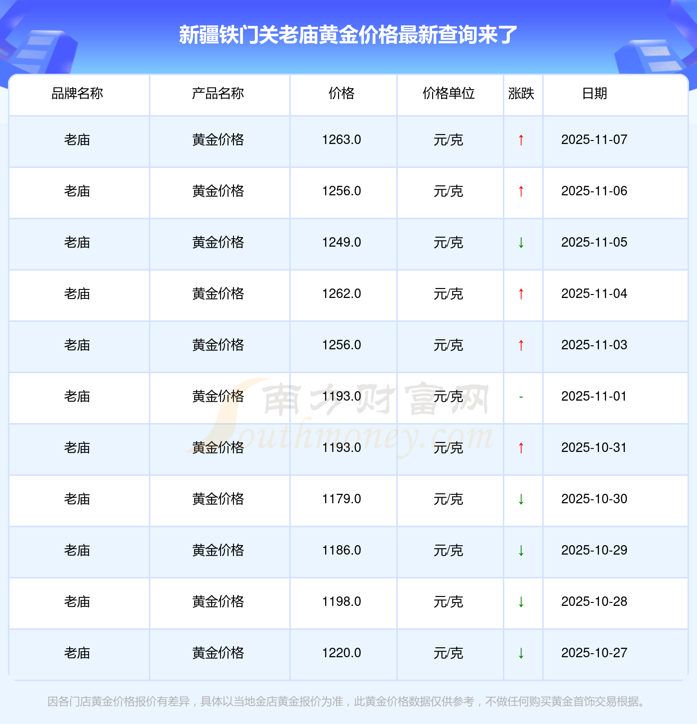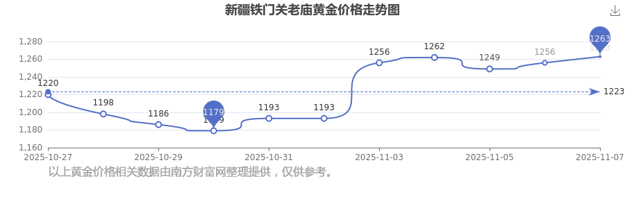 2025年11月9日,新疆鐵門(mén)關(guān)老廟黃金價(jià)格每克的售賣(mài)價(jià)位為1263.0元/克。