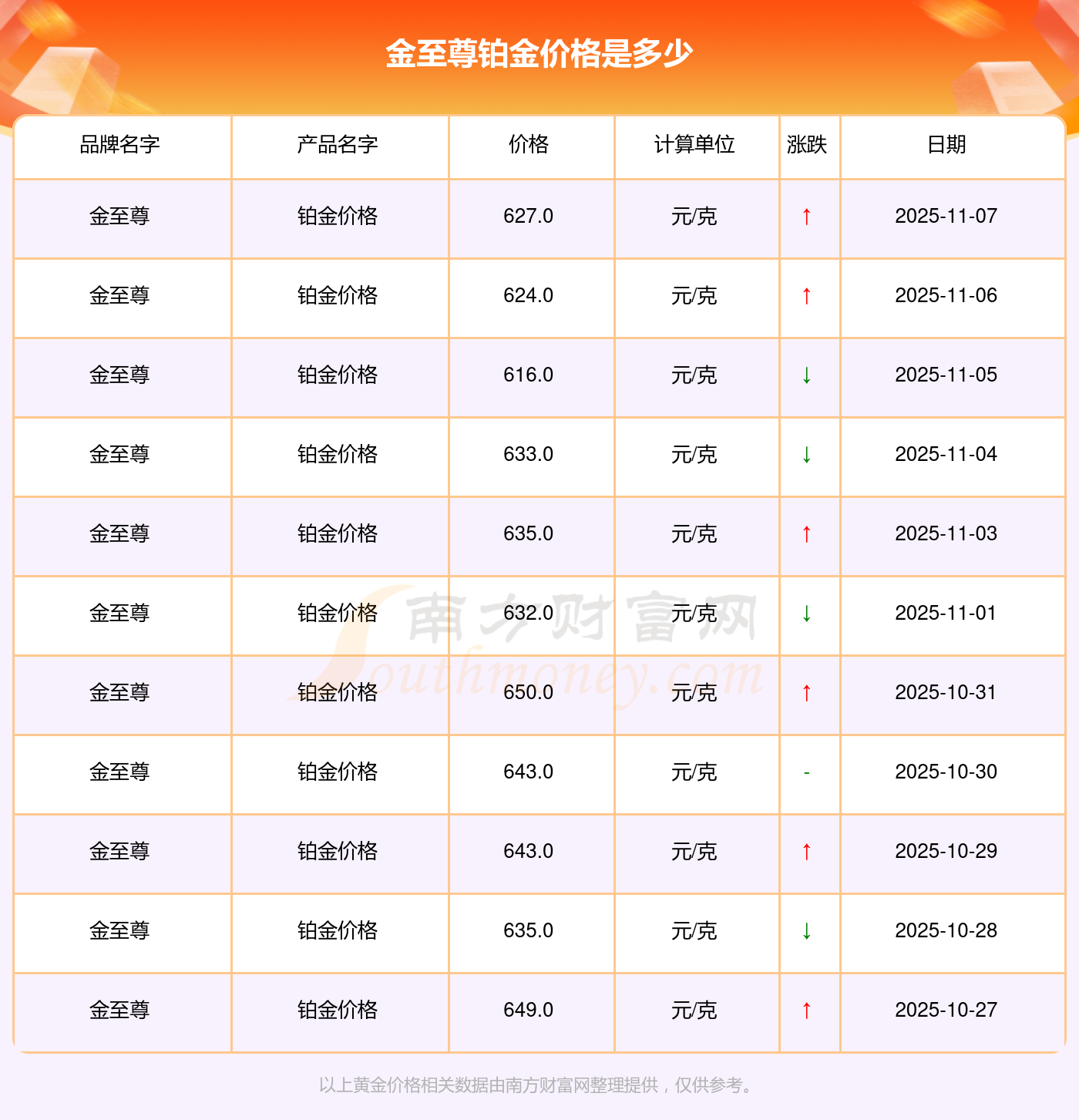 今日(2025年11月9日)金至尊鉑金價(jià)格的價(jià)格為627.0元/克。