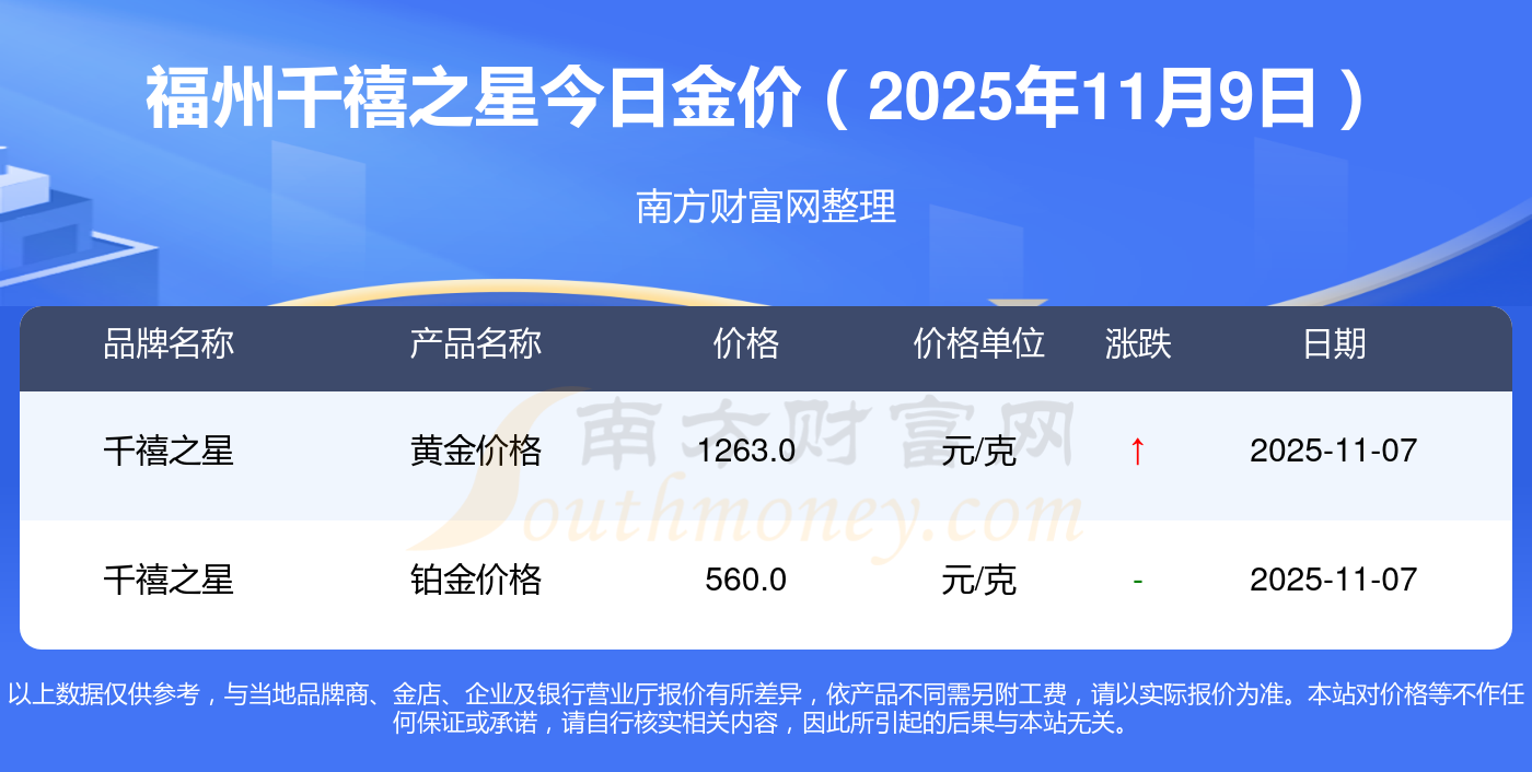 2025年11月9日福州千禧之星每克黃金的市場(chǎng)價(jià)格是多少:銀條價(jià)格11.4元/克,黃金價(jià)格1263.0元/克,鉑金價(jià)格560.0元/克,金條價(jià)格(內(nèi)地)1202.0元/克,金飾價(jià)格(內(nèi)地)1268.0元/克,黃金飾品(香港)44260.0,鉑金飾品(香港)13080.0,金條金價(jià)(香港)39960.0,投資金條1243.0元/克,工藝金條1258.0元/克,千足金首飾1248.0元/克。