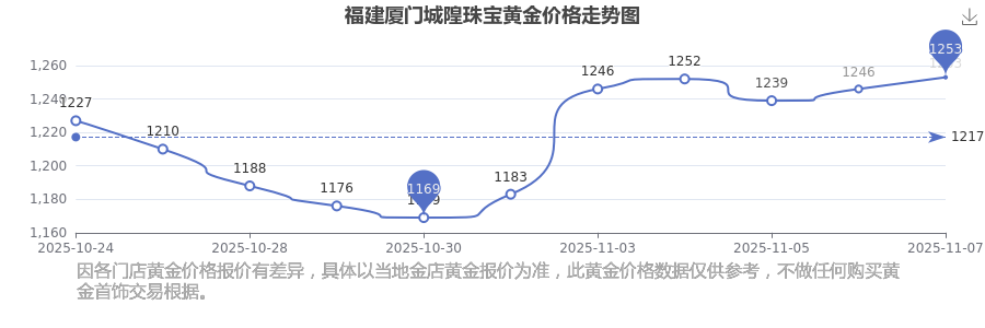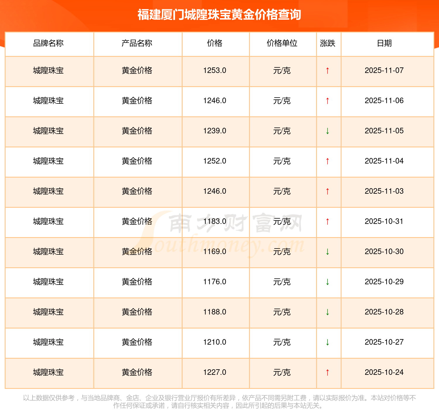 福建廈門城隍珠寶現(xiàn)在黃金價格多少錢1克,請問今天一克黃金值多少錢?今日福建廈門城隍珠寶黃金價格查詢,1253.0元/克,此乃福建廈門城隍珠寶于 2025年11月9日黃金價格的掛牌價格。