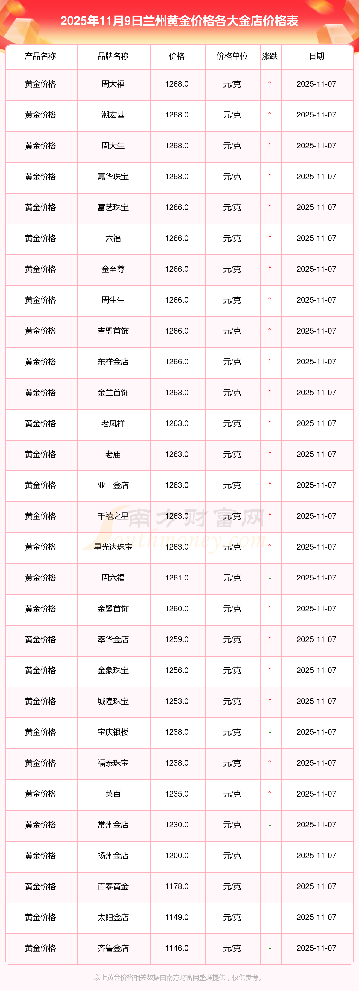 2025年11月9日蘭州各大金店黃金價格最新價格查詢來了:寶泉錢幣11.4元/克,金蘭首飾1263.0元/克,金蘭首飾560.0元/克,謝瑞麟1202.0元/克,謝瑞麟1268.0元/克,謝瑞麟44260.0,謝瑞麟13080.0,謝瑞麟39960.0,金銀街1243.0元/克,金銀街1258.0元/克,金銀街1248.0元/克。