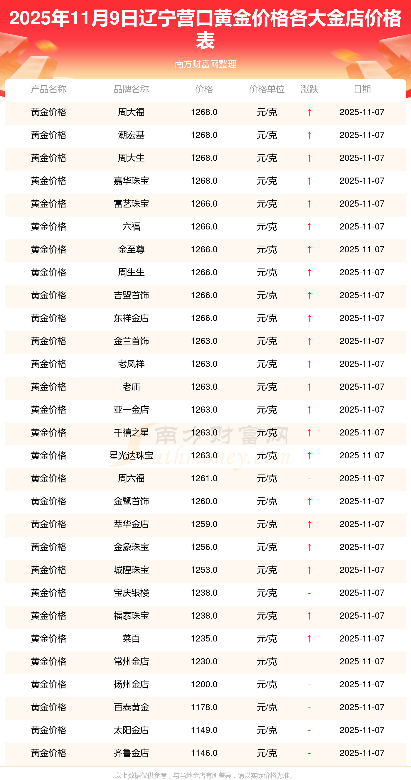 今天是2025年11月9日,遼寧營口寶泉錢幣、金蘭首飾、金蘭首飾、謝瑞麟、謝瑞麟、謝瑞麟、謝瑞麟、謝瑞麟、金銀街、金銀街、金銀街等各大金店品牌黃金價格最新價格行情是這樣的:寶泉錢幣11.4元/克、金蘭首飾1263.0元/克、金蘭首飾560.0元/克、謝瑞麟1202.0元/克、謝瑞麟1268.0元/克、謝瑞麟44260.0、謝瑞麟13080.0、謝瑞麟39960.0、金銀街1243.0元/克、金銀街1258.0元/克、金銀街1248.0元/克。