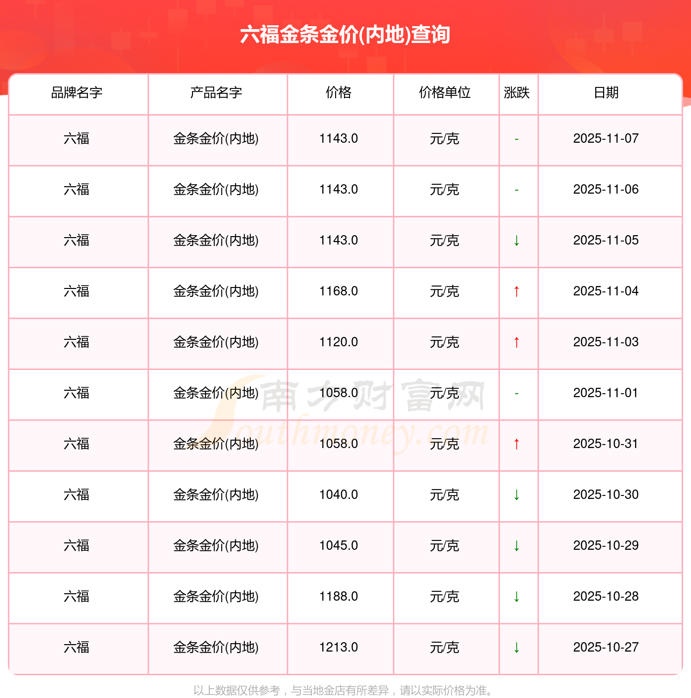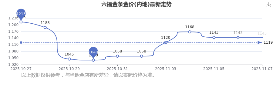 今日六福 金條金價(內(nèi)地)最新的克重售價為1143.0元/克。