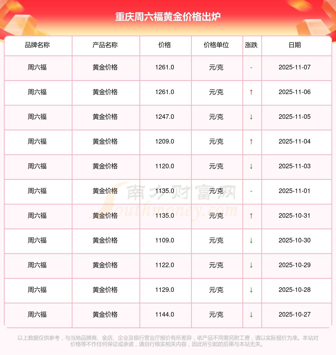 2025年11月9日,重慶周六福黃金價(jià)格每克的價(jià)值量定格在1261.0元/克。