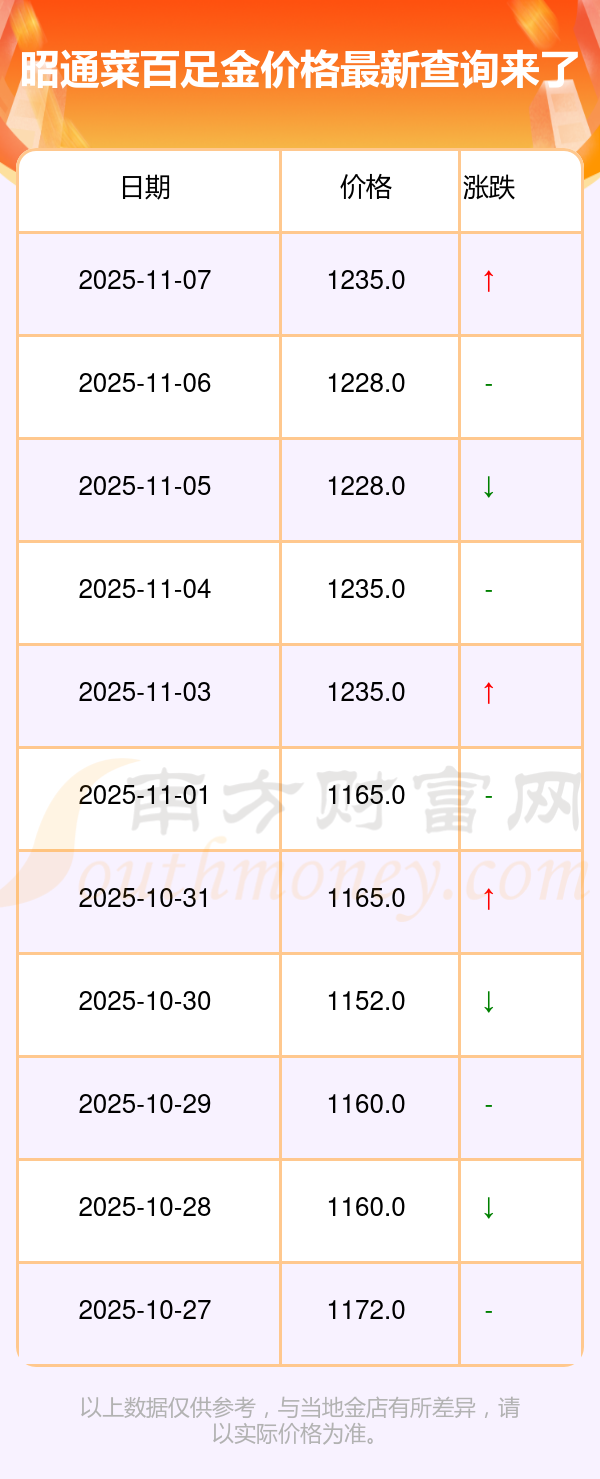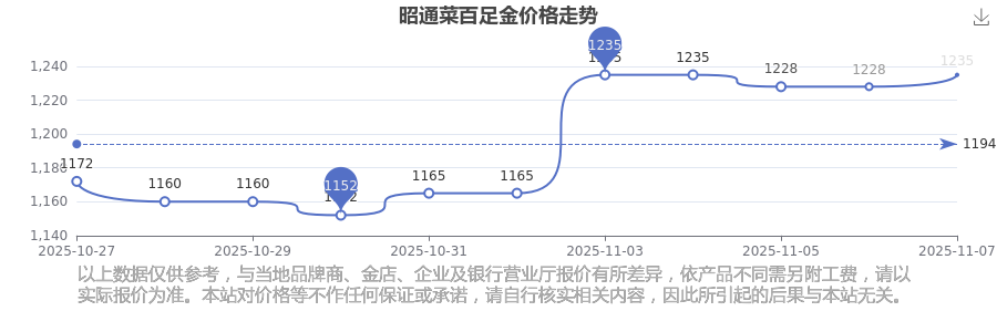 2025年11月9日昭通菜百足金價格為1235.0元/克。