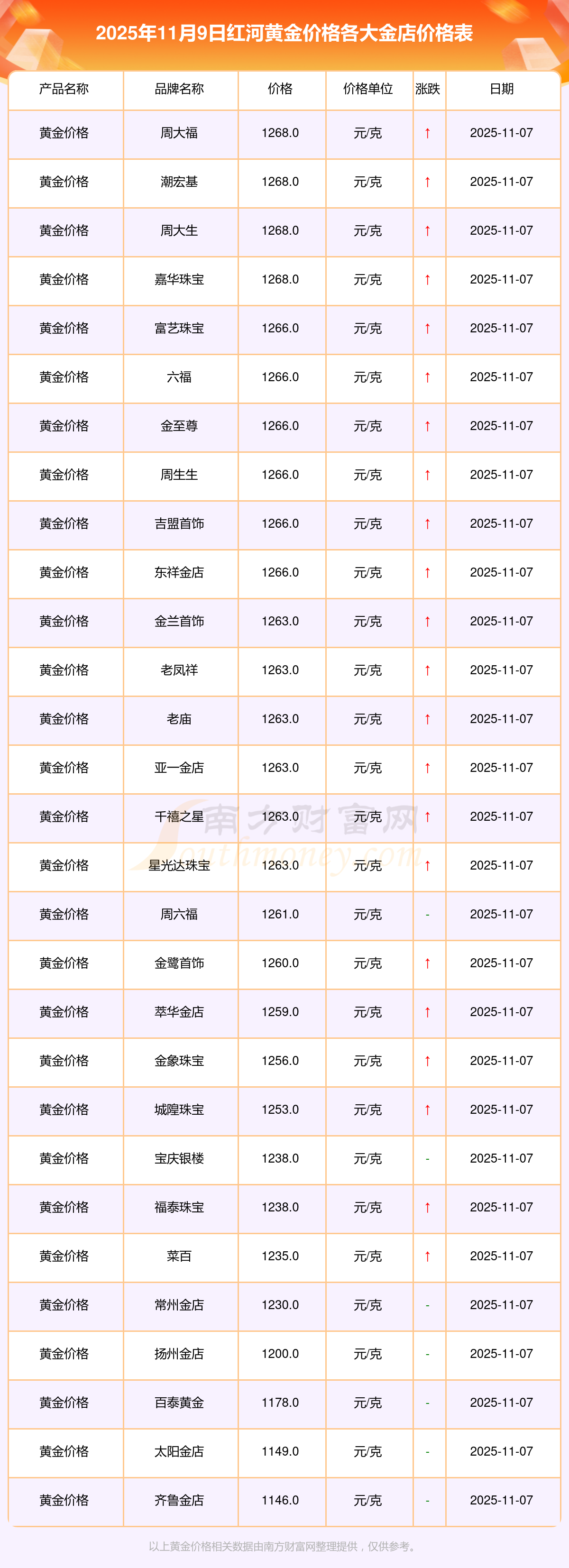 2025年11月9日,紅河寶泉錢幣、金蘭首飾、金蘭首飾、謝瑞麟、謝瑞麟、謝瑞麟、謝瑞麟、謝瑞麟、金銀街、金銀街、金銀街等各大金店品牌黃金價格今日價格行情最新來了:寶泉錢幣11.4元/克、金蘭首飾1263.0元/克、金蘭首飾560.0元/克、謝瑞麟1202.0元/克、謝瑞麟1268.0元/克、謝瑞麟44260.0、謝瑞麟13080.0、謝瑞麟39960.0、金銀街1243.0元/克、金銀街1258.0元/克、金銀街1248.0元/克。