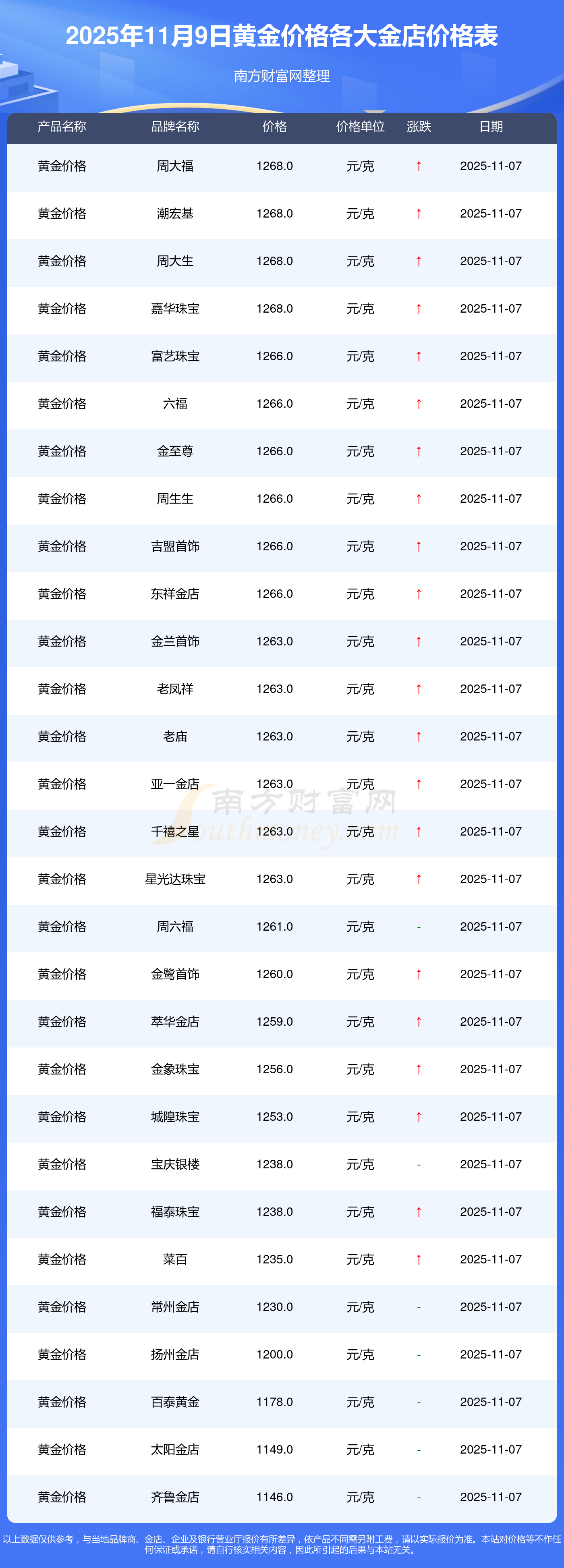 今天是2025年11月9日,寶泉錢幣、金蘭首飾、金蘭首飾、謝瑞麟、謝瑞麟、謝瑞麟、謝瑞麟、謝瑞麟、金銀街、金銀街、金銀街等各大金店品牌黃金價格最新價格如下:寶泉錢幣11.4元/克、金蘭首飾1263.0元/克、金蘭首飾560.0元/克、謝瑞麟1202.0元/克、謝瑞麟1268.0元/克、謝瑞麟44260.0、謝瑞麟13080.0、謝瑞麟39960.0、金銀街1243.0元/克、金銀街1258.0元/克、金銀街1248.0元/克。