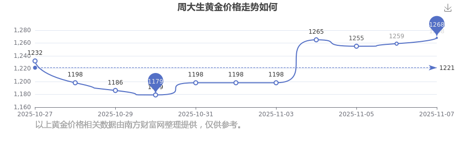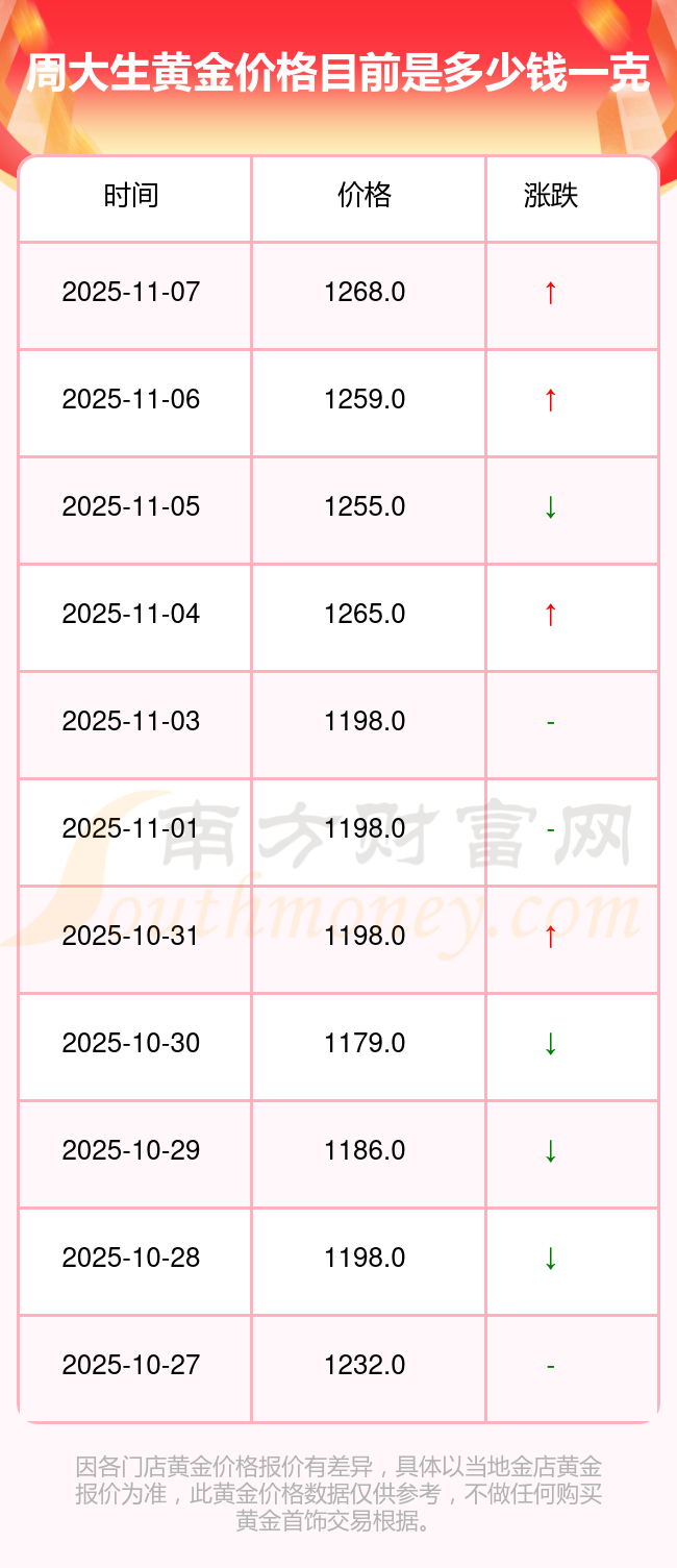周大生今日 黃金價(jià)格的最新市場(chǎng)行情價(jià)為1268.0元/克。