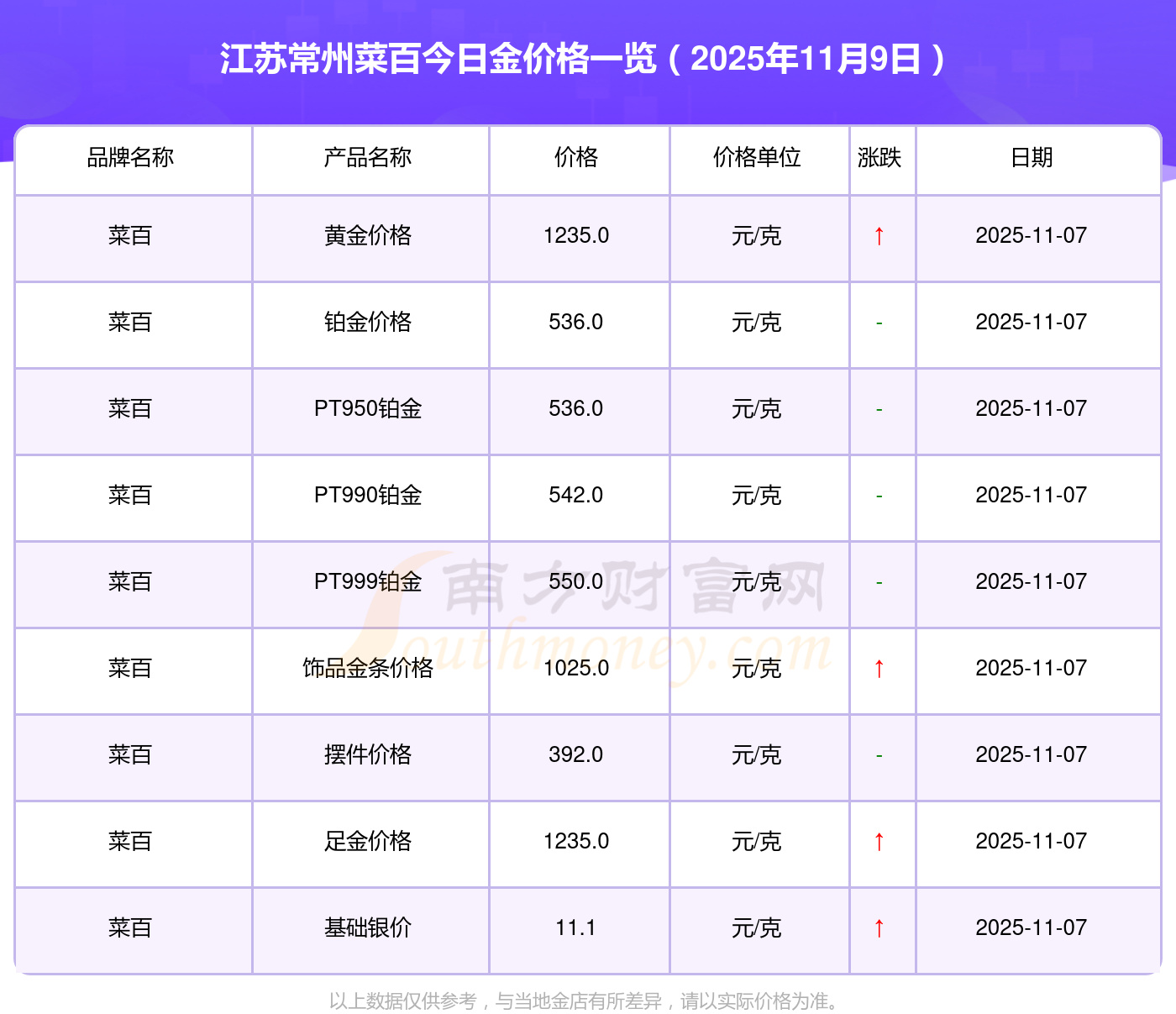 以上數(shù)據(jù)僅供參考,與當(dāng)?shù)亟鸬暧兴町悾?qǐng)以實(shí)際價(jià)格為準(zhǔn)。