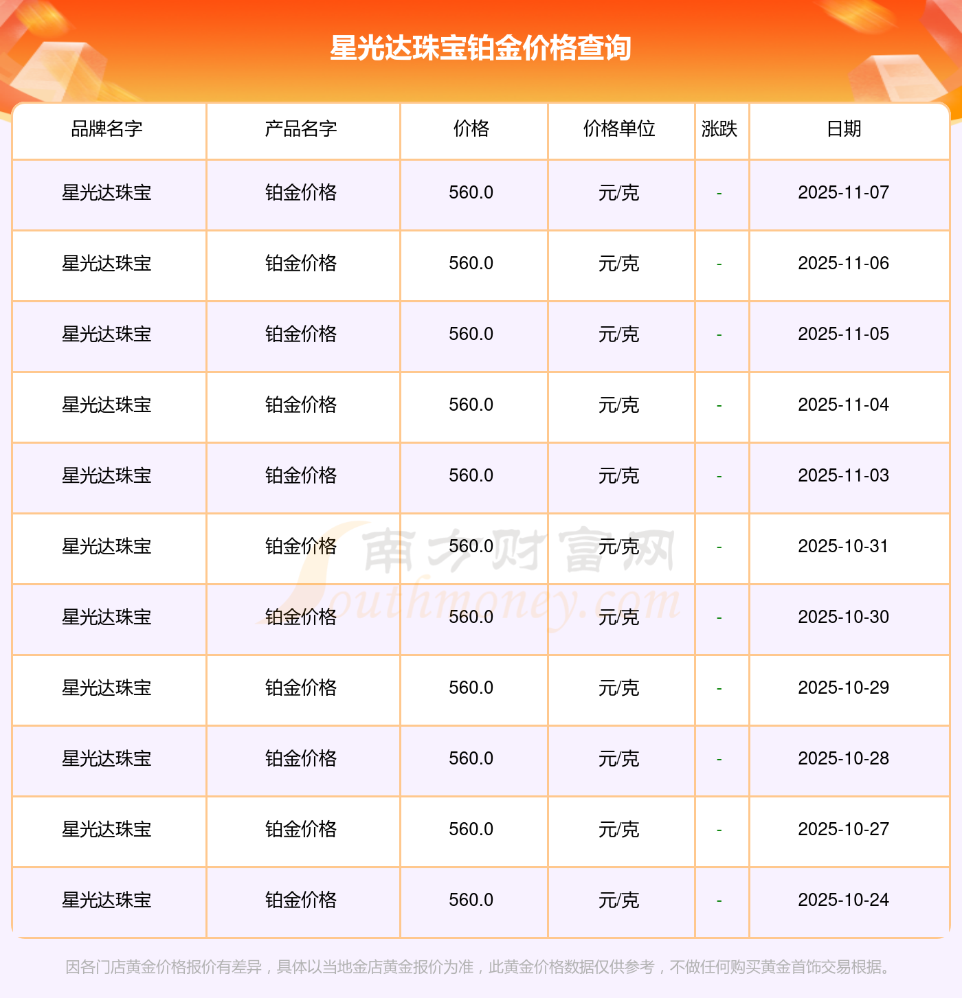 星光達(dá)珠寶鉑金價(jià)格多少錢(qián)一克呢?(2025年11月9日價(jià)格最新查詢(xún)),一起來(lái)看看吧!