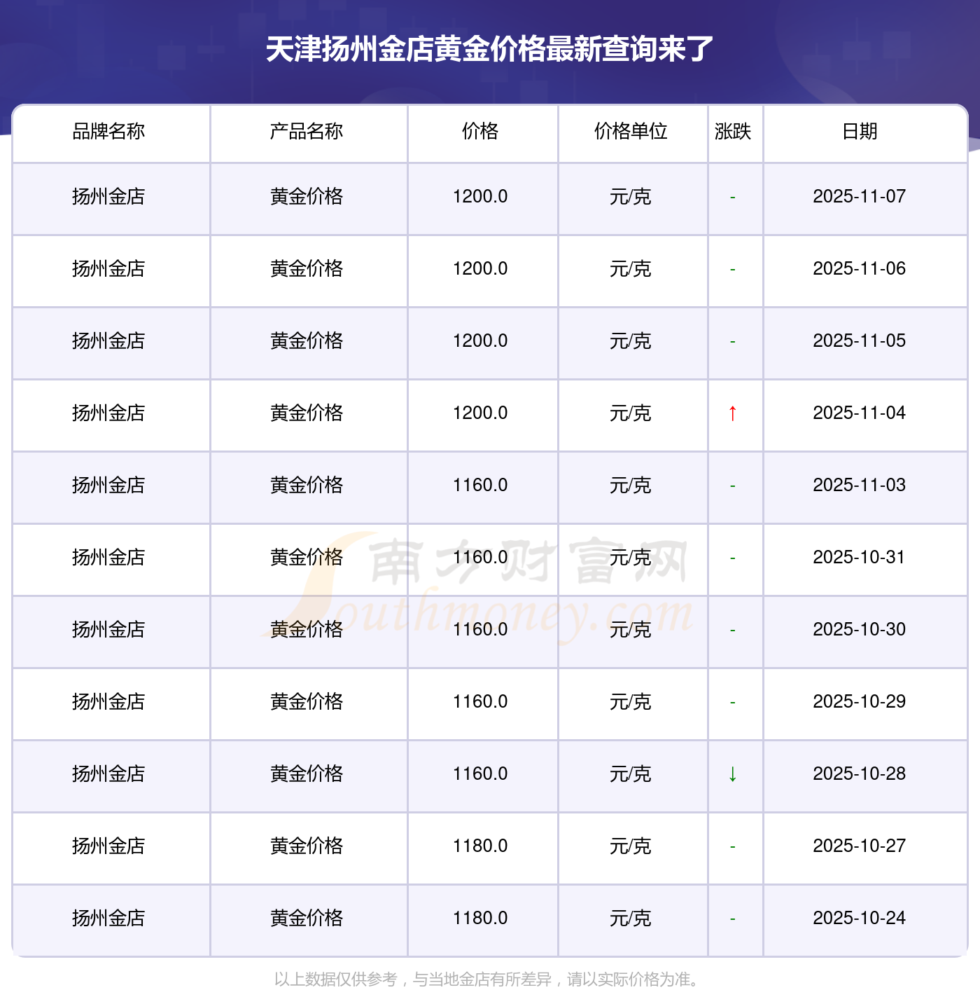 于 2025年11月9日,天津揚(yáng)州金店黃金價(jià)格的克價(jià)為1200.0元/克。