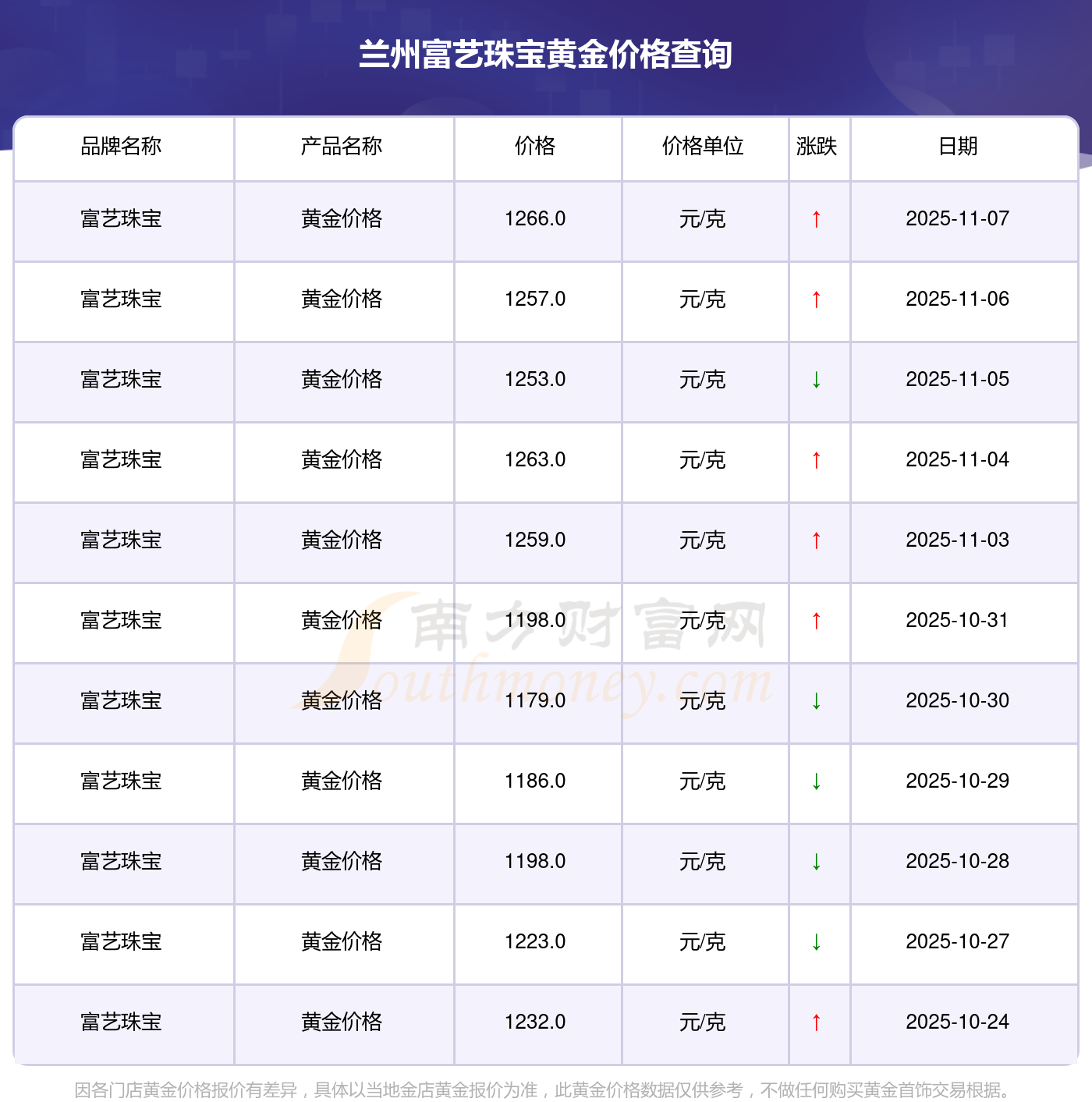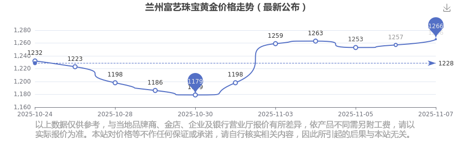 2025年11月9日蘭州富藝珠寶黃金價格是1266.0元/克。